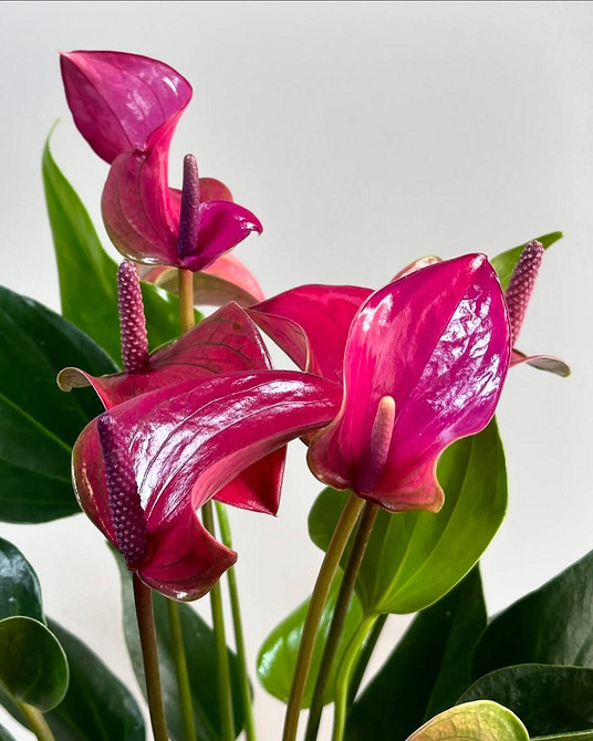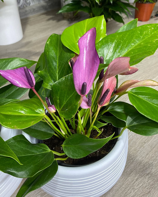Это достаточно редкие сорта антуриума: крайне сложно найти разновидности, которые были бы полностью фиолетовыми. Как правило, сперва их цветки выглядят розовыми, а затем постепенно меняют оттенок ближе к лиловому.