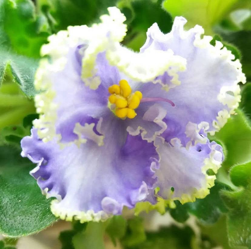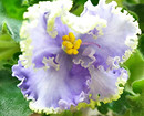- Окраска цветка: каемчатого типа. Лепестки синие, по краю — белая гофрированная каемка и легкий рюш салатового цвета.