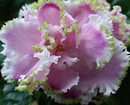 - Окраска цветка: лепестки нежно-розовые с тесьмой малинового цвета и золотисто-зеленой бахромой.