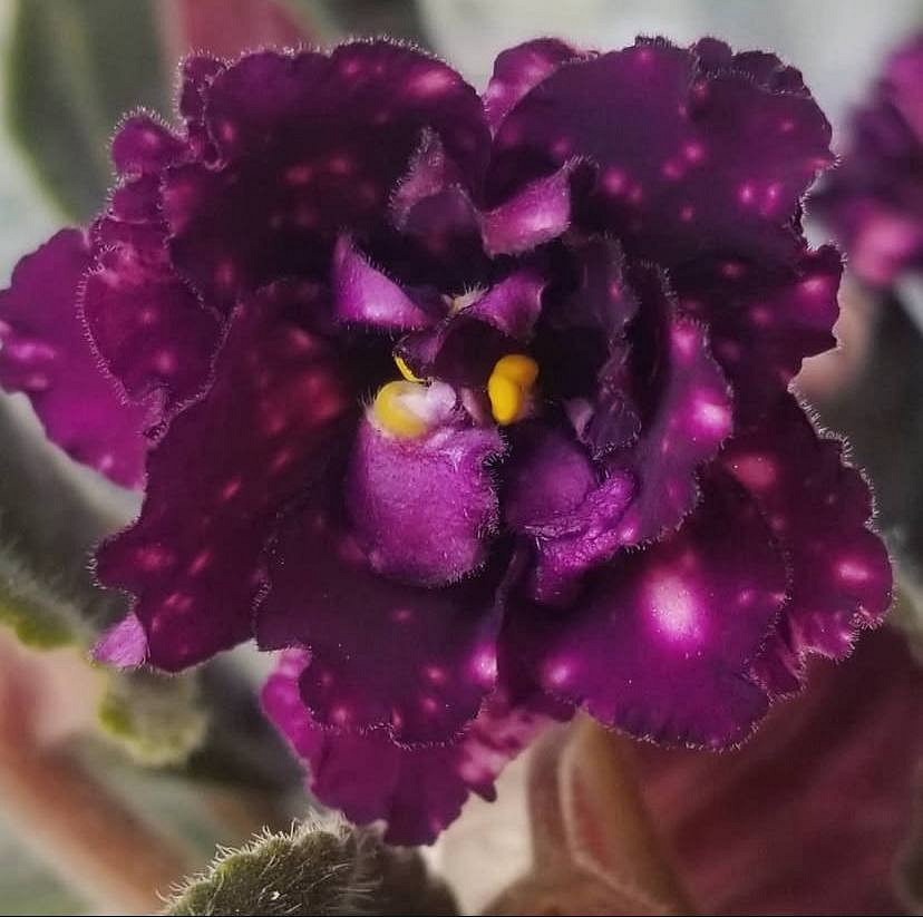 - Окраска цветка: фэнтези, двухцветная. Лепестки с махровыми краями темно-бордового или сливового цвета со светлыми горохами-фэнтези.