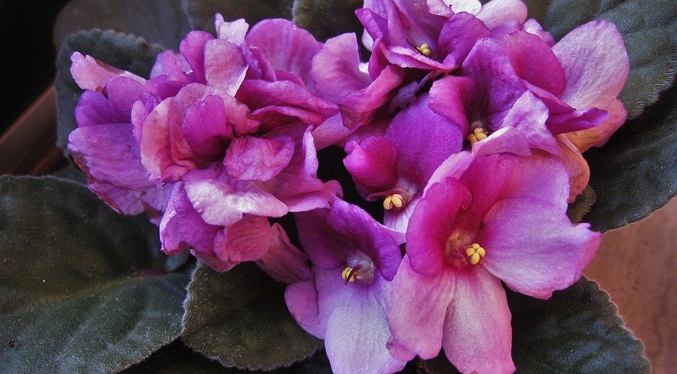 Она же сенполия или узамбарская фиалка. Первые экземпляры были найдены в горных областях Танзании и Кении, от них произошли более 32 тысяч современных разновидностей. Это небольшой кустик с маленькими цветками, собранными в гроздь. Их расцветки самые разнообразные, встречаются даже зеленые экземпляры разных оттенков. Лепестки могут быть однотонные, полосатые, с каймой или пятнышками. При создании благоприятных условий фиалка может непрерывно находиться в цвету.