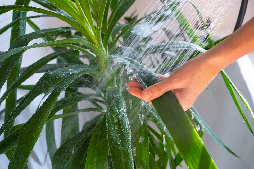 Куст любит обильный полив, но без переувлажнения. Излишняя влажность приводит к загниванию корней. В фазу активного роста юкку в среднем поливают раз в неделю, в период покоя — раз в 10-12 дней. Перед поливом обязательно проверяют состояние земляного кома. Если сверху он подсох, требуется полив. Опрыскивание цветку чаще всего не требуется. Лучше периодически протирать листочки влажной губкой или устраивать «помывку» под душем. Опрыскивать юкку нужно только в очень сухом воздухе, например, при усиленной работе отопительных приборов.