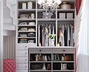 Женскую гардеробную чаще всего оформляют в светлых тонах. Если позволяет площадь, в ней устанавливают туалетный столик и пуфик. На пол часто кладут ковер, стены украшают картинами.