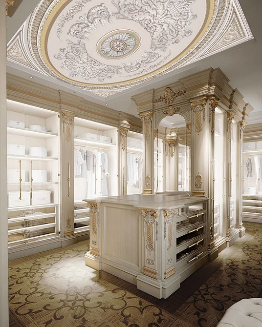 Чаще всего женская гардеробная выдержана в классическом стиле или имеет элементы рококо и барокко. Допустимо использование лепнины и другое декорирование.