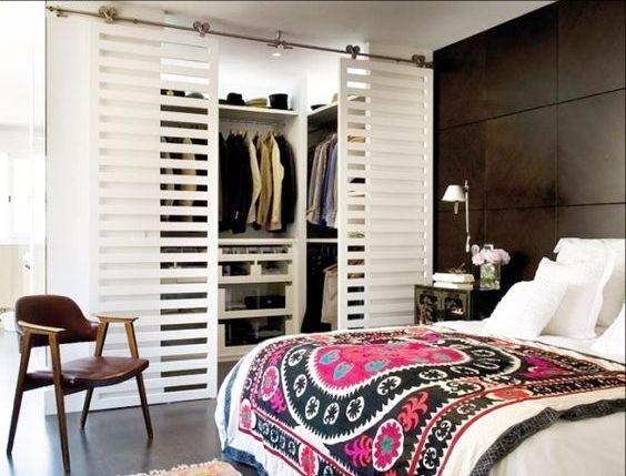 Применяя зонирование с помощью раздвижных дверей или арок, в спальне можно выделить место под небольшую гардеробную комнату.