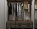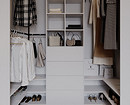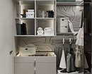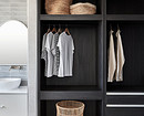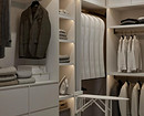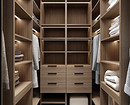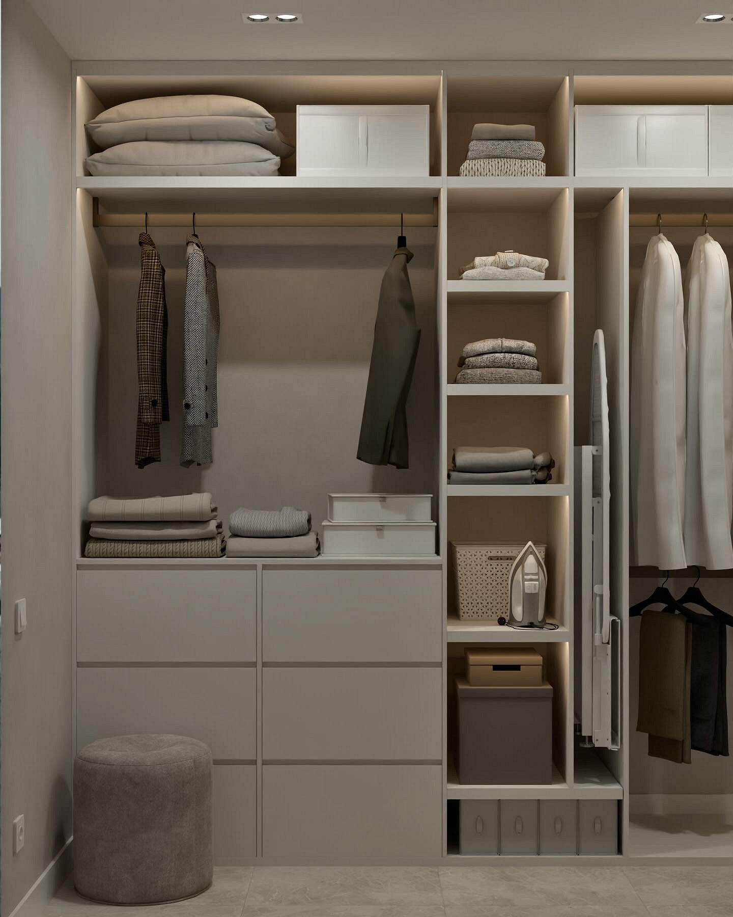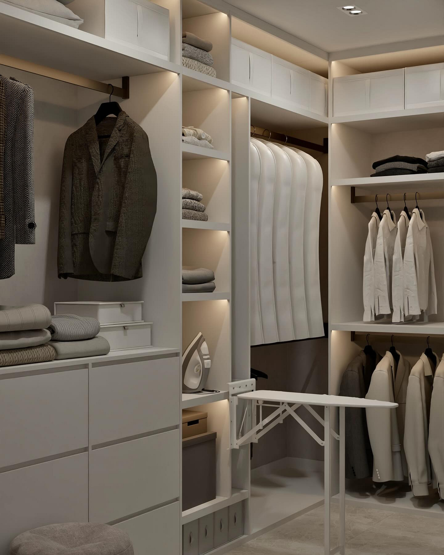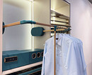 - Встроенная гладильная доска, которая откидывается от стены или выезжает из ящика, позволяет привести вещи в порядок прямо в гардеробной и занимает намного меньше места, чем стандартная модель.
