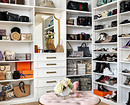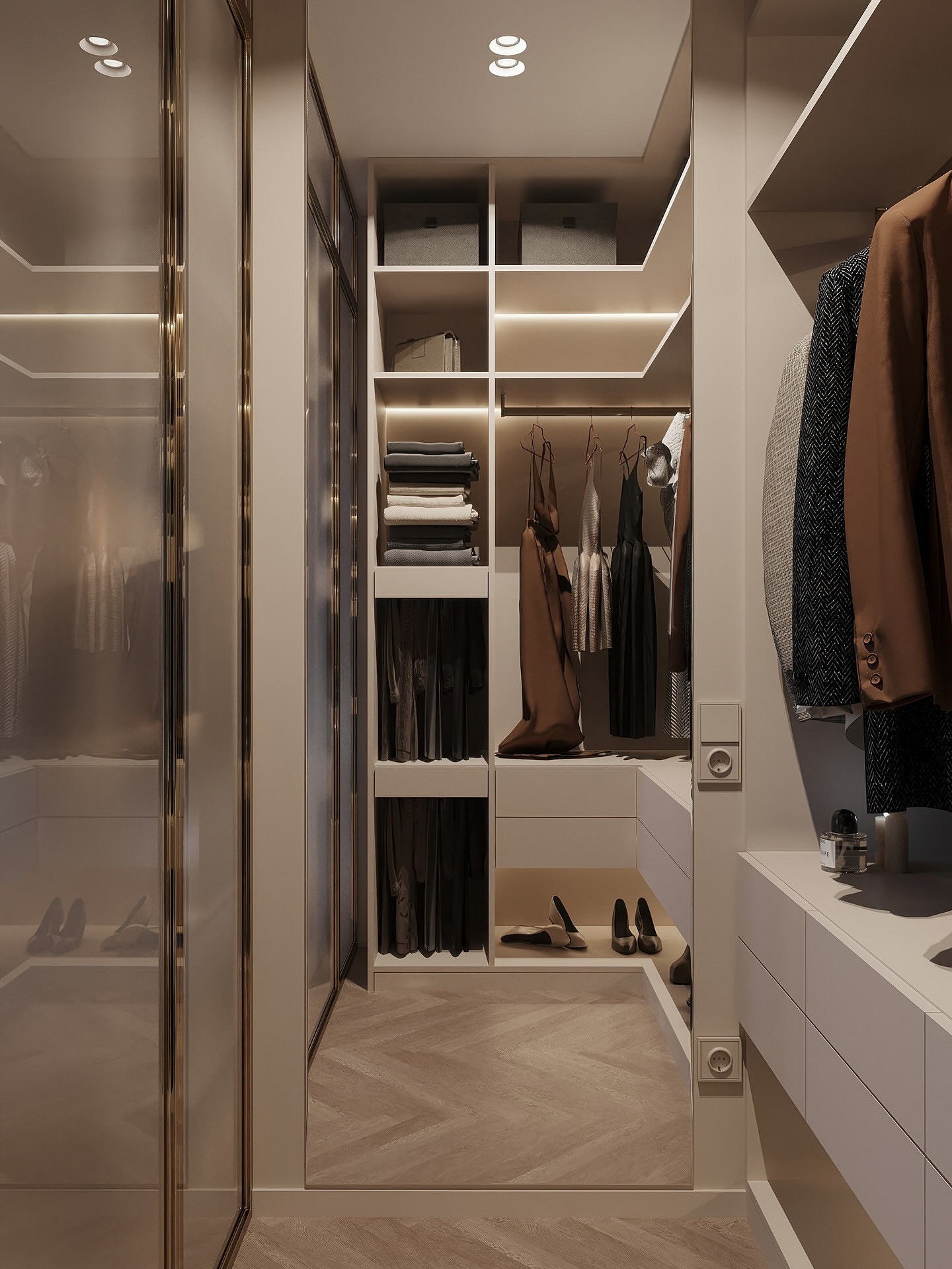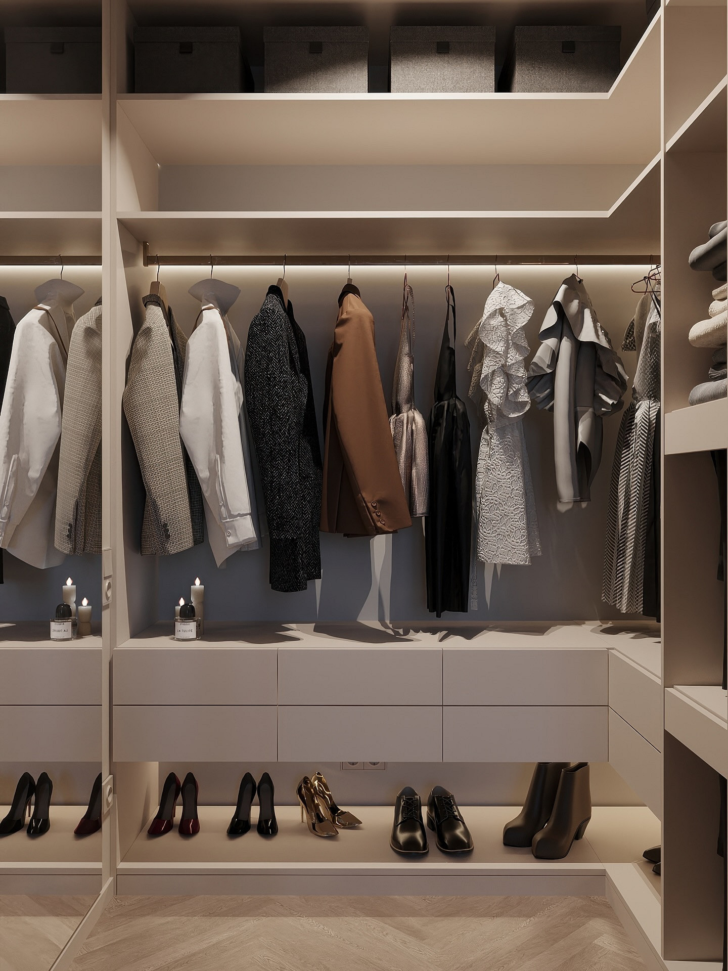 В женской гардеробной основной акцент делается на разнообразии типов хранения. Здесь необходимо предусмотреть высокие секции для вечерних платьев и длинных пальто, а также большое количество полок для сумок и трикотажа. Особое внимание уделяется мелочам: выдвижным лоткам для украшений, аксессуаров и парфюмерии. Для обуви лучше использовать наклонные полки — так нужная пара всегда будет на виду.
