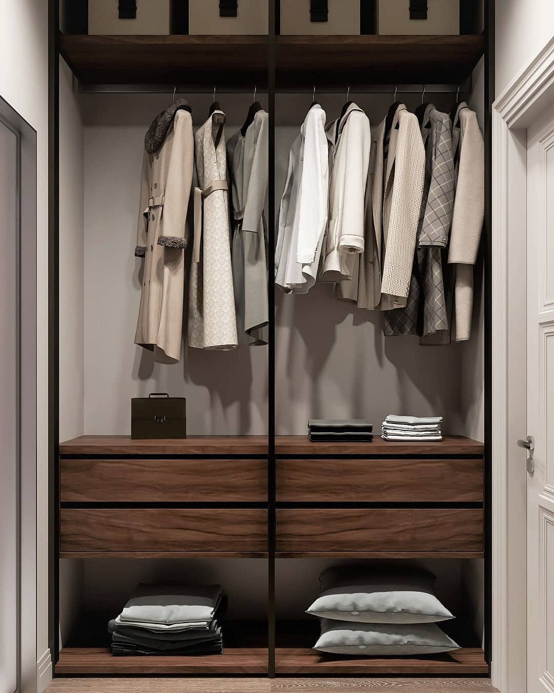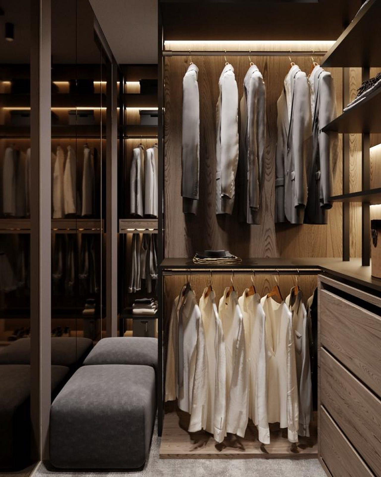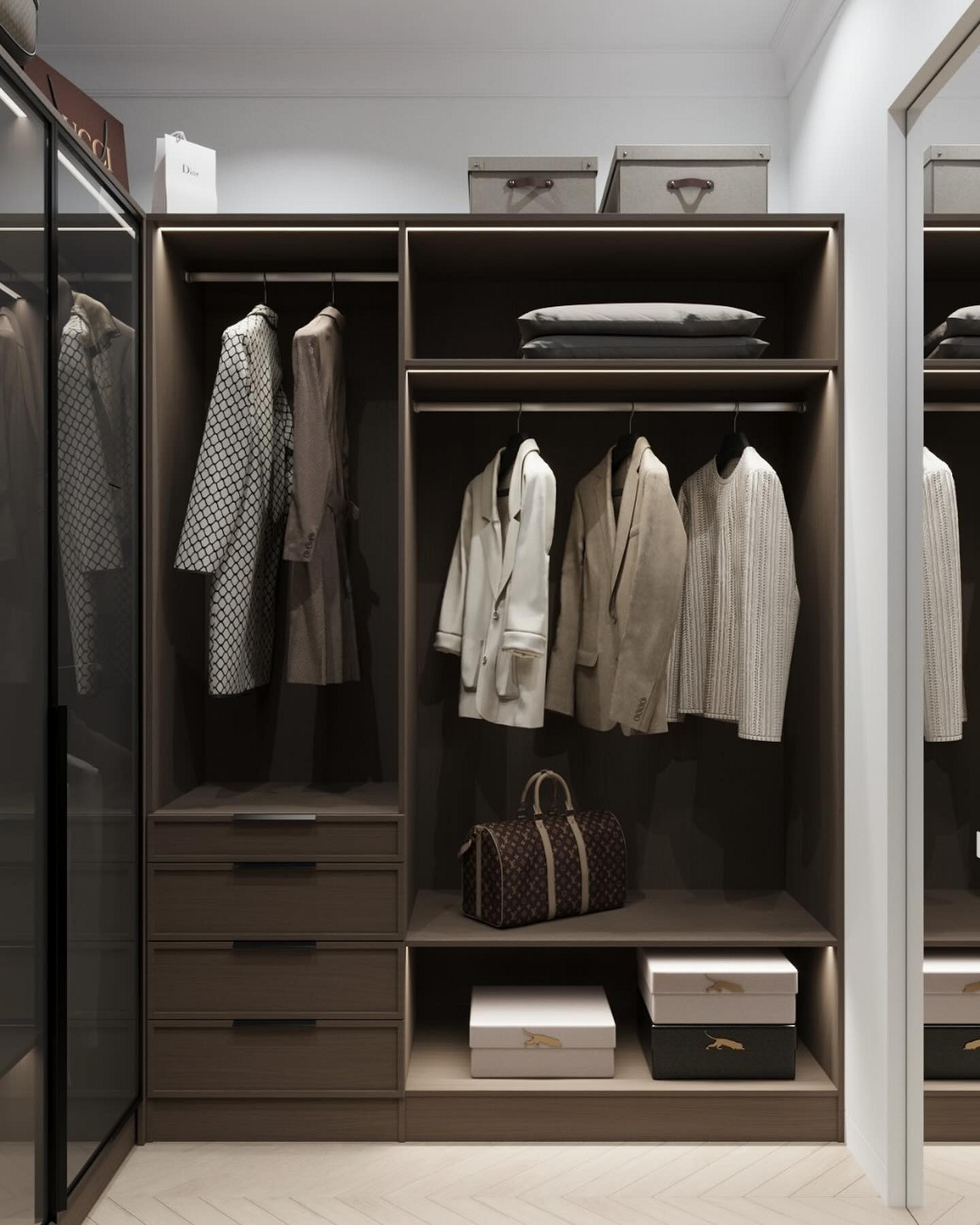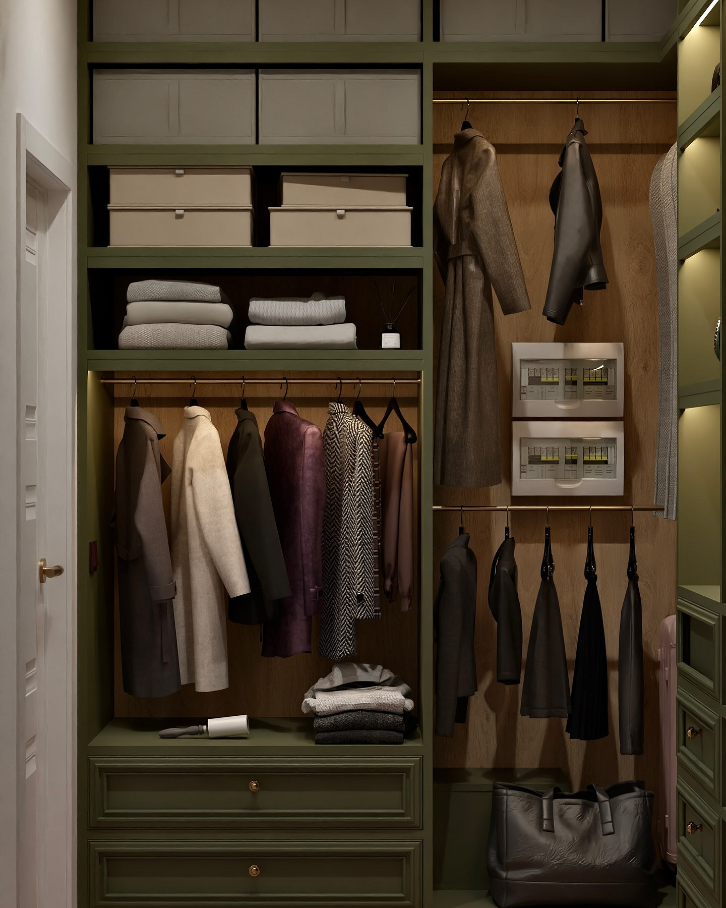 Мужской гардероб, как правило, более структурирован и лаконичен. Нужно добавить достаточно штанг для рубашек и пиджаков, а также специализированные аксессуары: брючницы, вешалки для галстуков и ремней, отсек для часов и запонок. Вместо глубоких полок мужчины чаще выбирают выдвижные ящики — в них проще поддерживать порядок и быстрее находить нужные вещи.