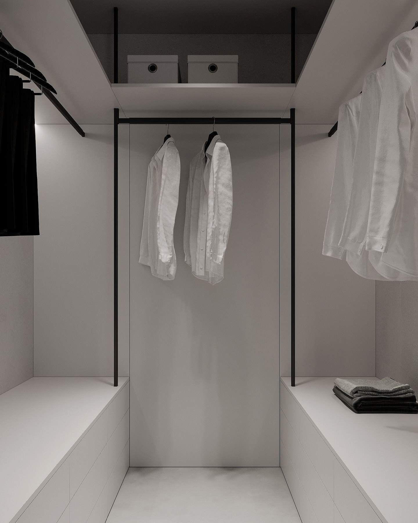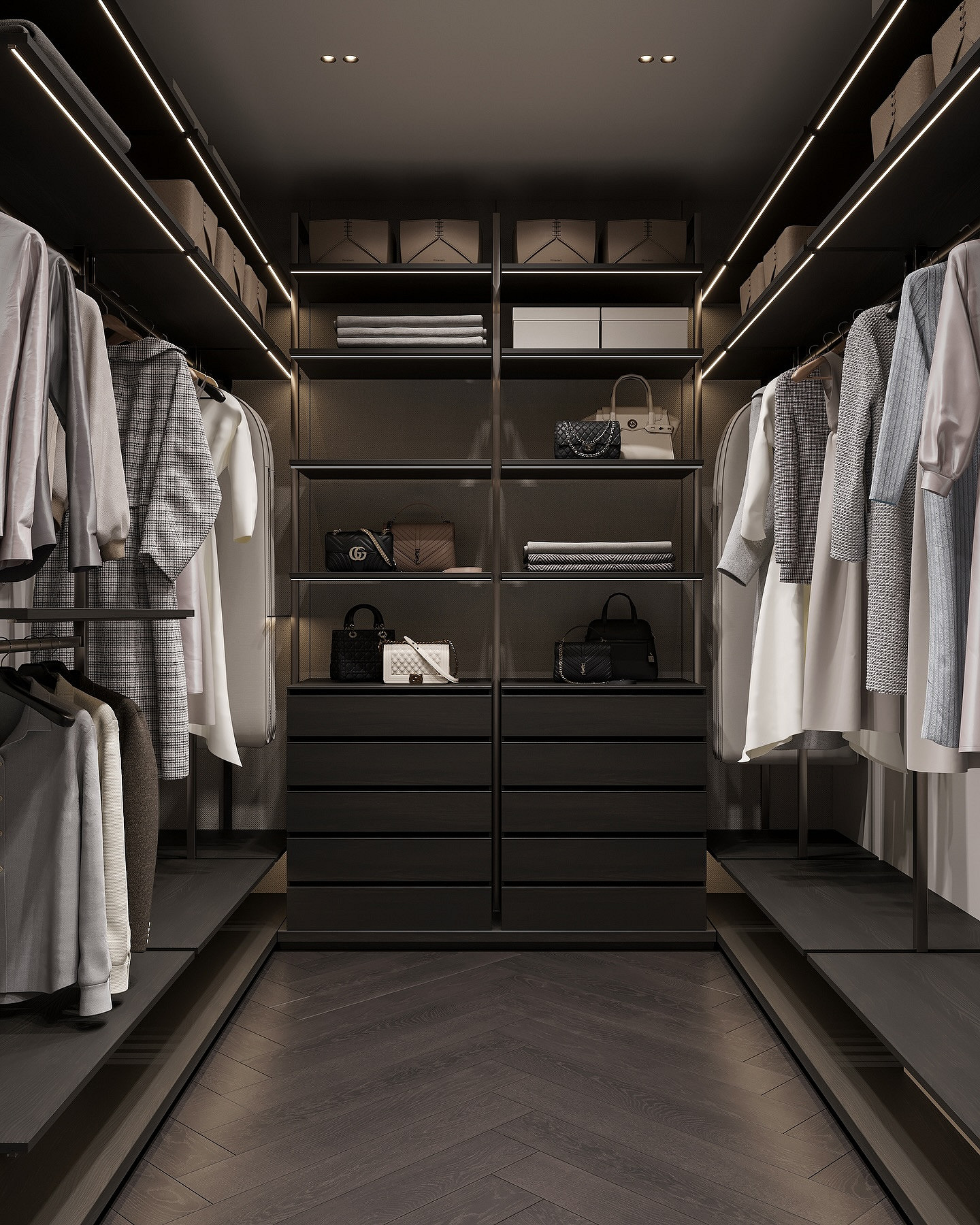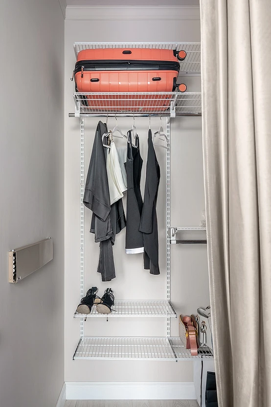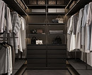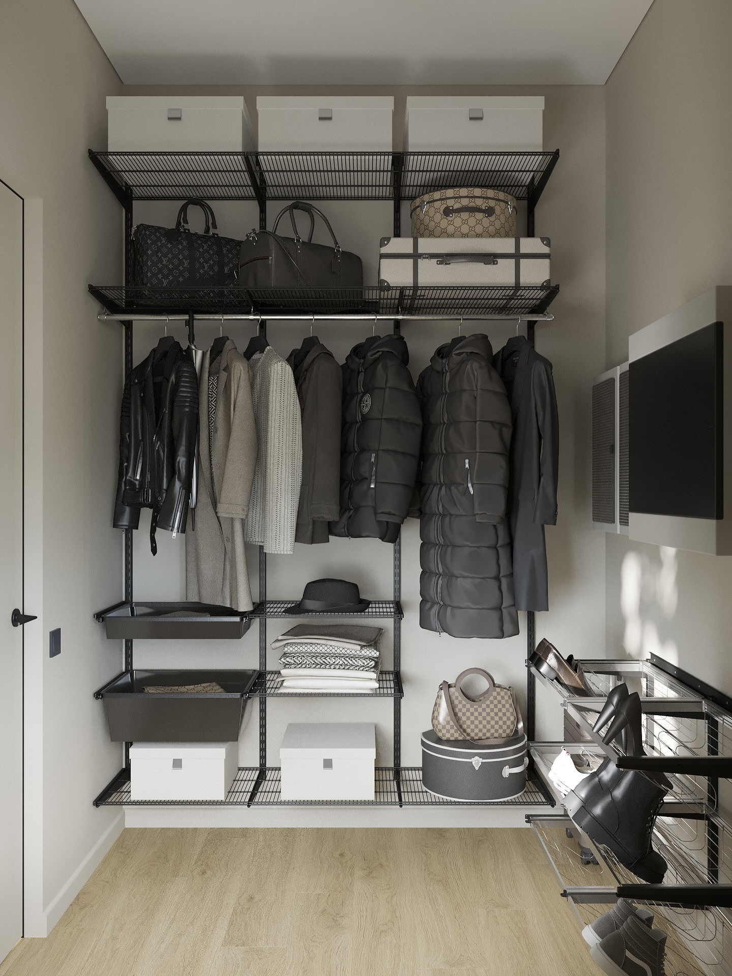 Мужской гардероб, как правило, более структурирован и лаконичен. Нужно добавить достаточно штанг для рубашек и пиджаков, а также специализированные аксессуары: брючницы, вешалки для галстуков и ремней, отсек для часов и запонок. Вместо глубоких полок мужчины чаще выбирают выдвижные ящики — в них проще поддерживать порядок и быстрее находить нужные вещи.