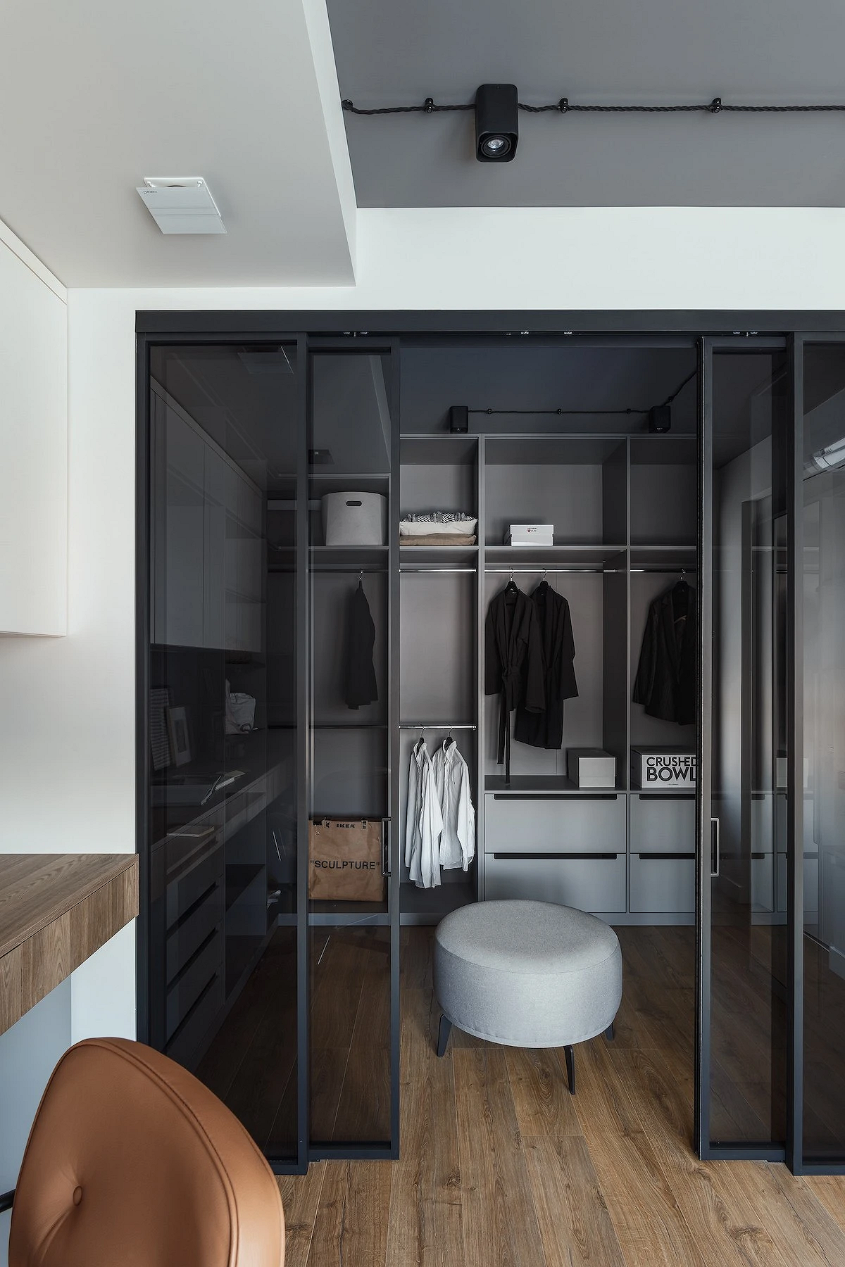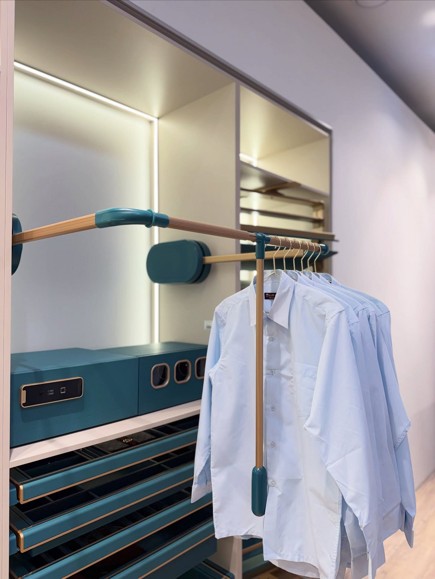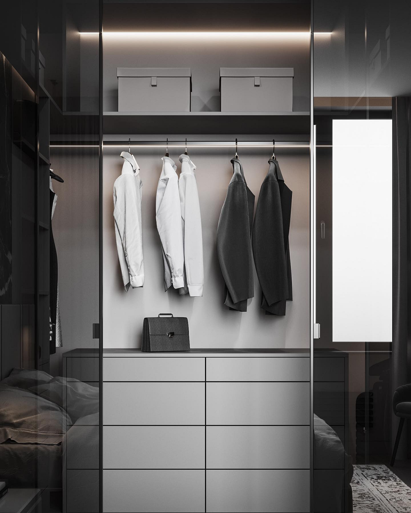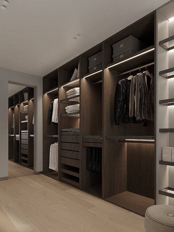 Мужской гардероб, как правило, более структурирован и лаконичен. Нужно добавить достаточно штанг для рубашек и пиджаков, а также специализированные аксессуары: брючницы, вешалки для галстуков и ремней, отсек для часов и запонок. Вместо глубоких полок мужчины чаще выбирают выдвижные ящики — в них проще поддерживать порядок и быстрее находить нужные вещи.