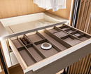 - Комфортная ширина прохода — от 60 см. Но если вы хотите сделать выдвижные ящики, закладывайте минимум 80-100 см, иначе вы просто не сможете полностью выдвинуть секцию и стоять перед ней.