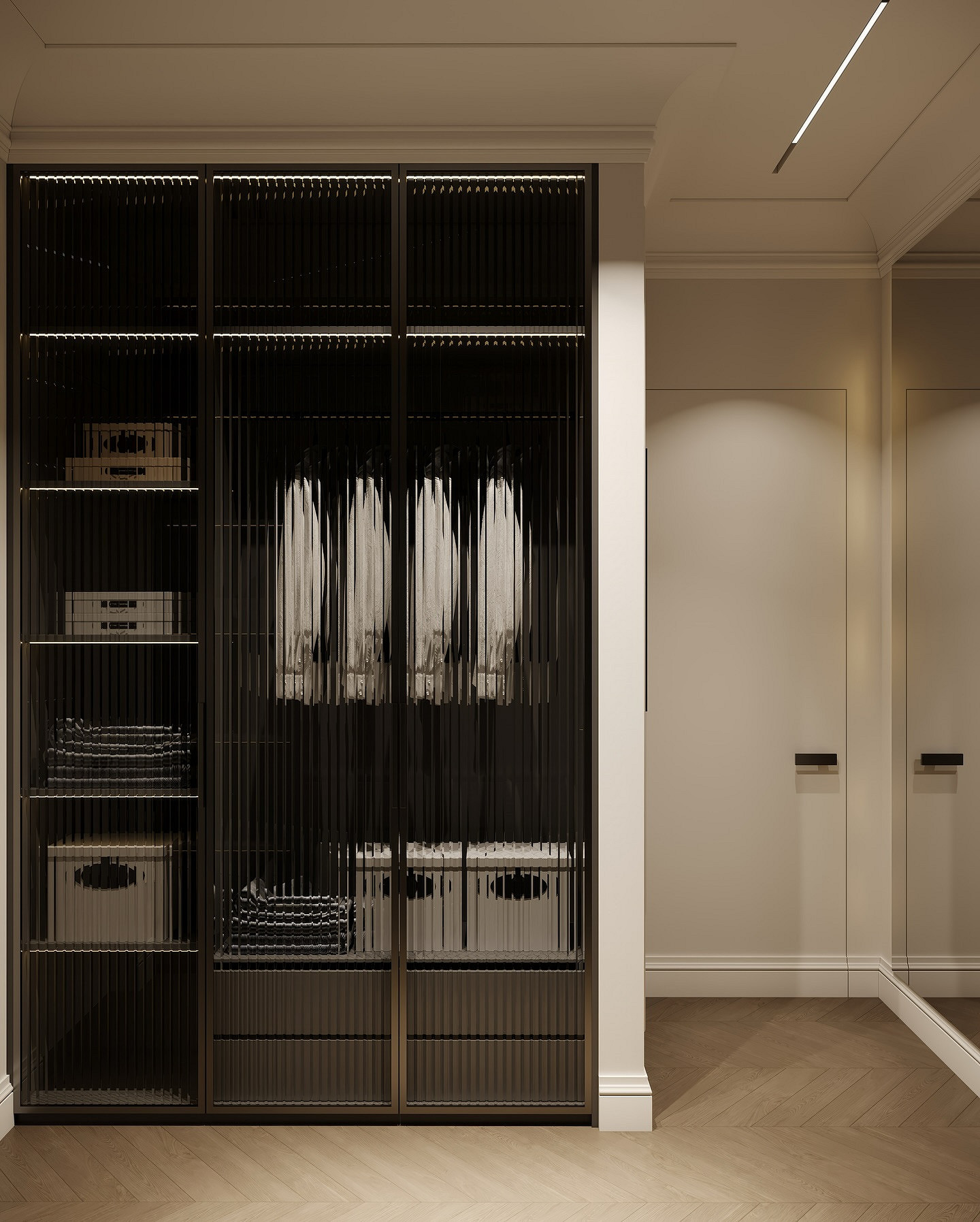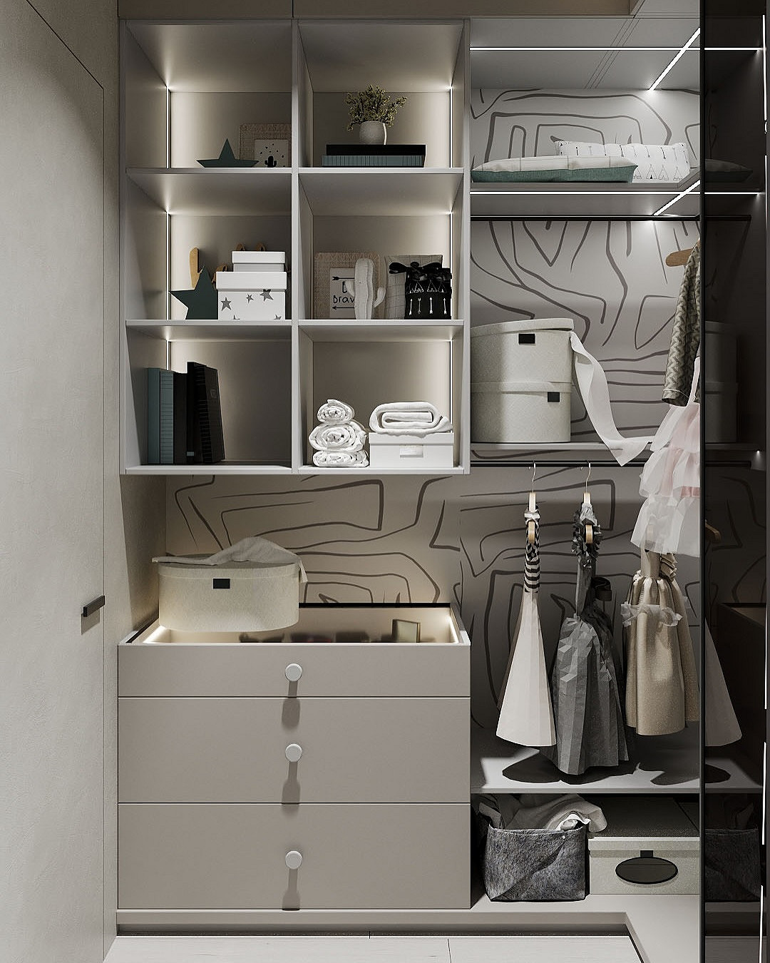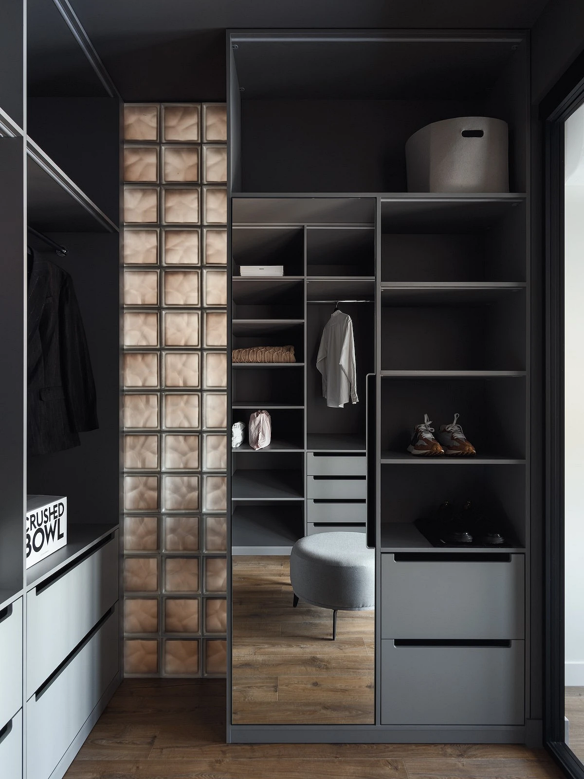 Современные решения позволяют как полностью скрыть зону хранения, так и превратить ее в эффектный акцент.