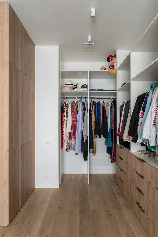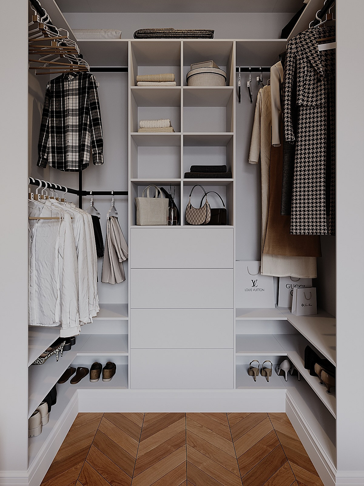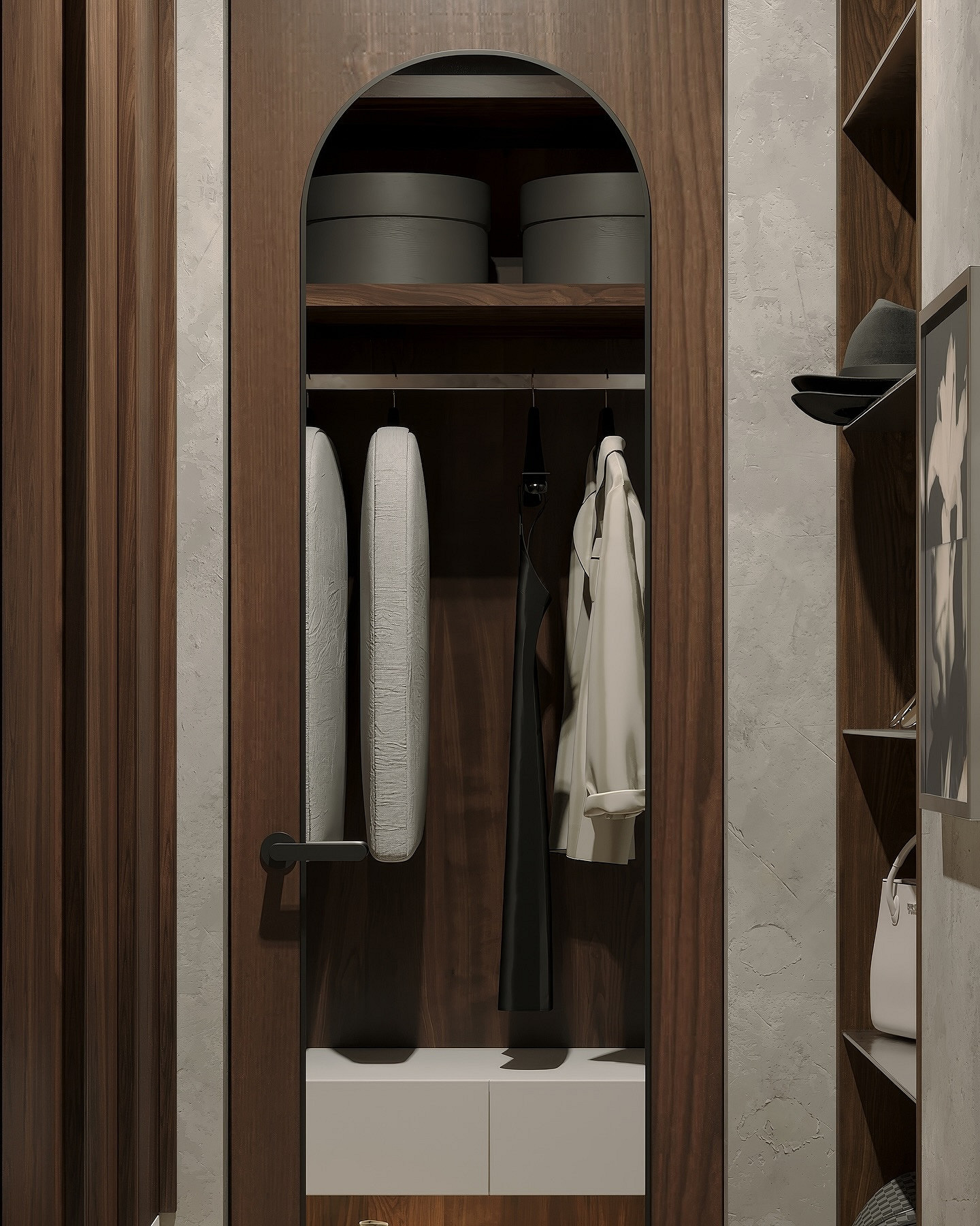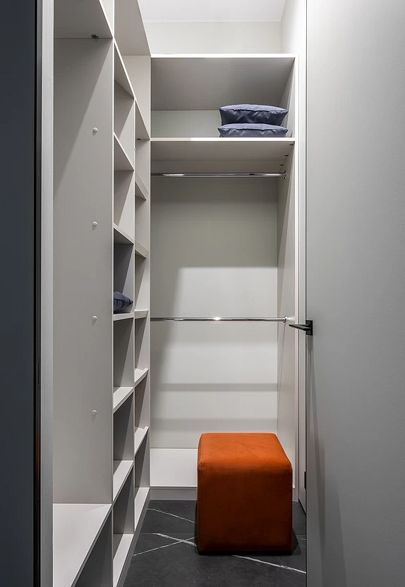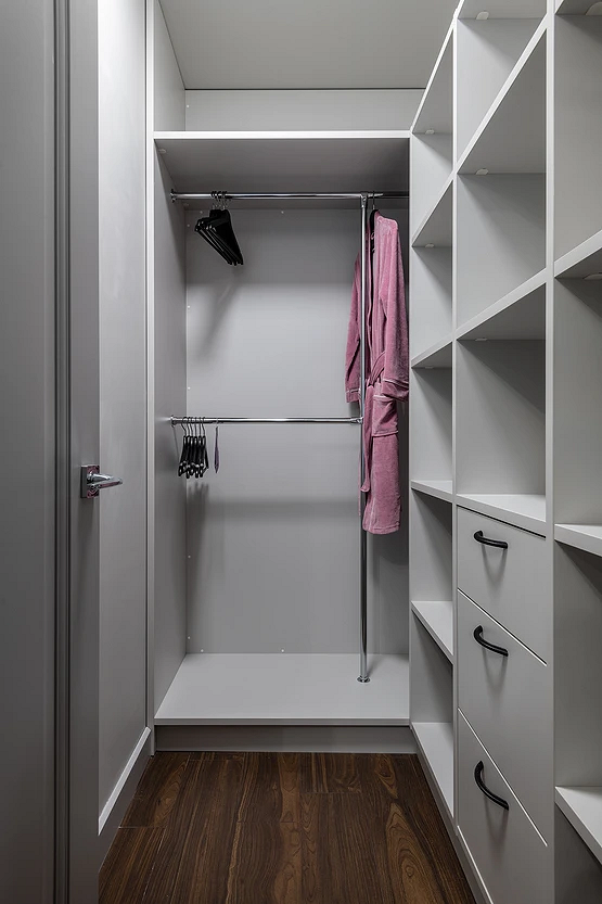 Форма гардеробной зависит от площади и расположения дверного проема. Правильная геометрия помогает задействовать все зоны и логично организовать хранение.