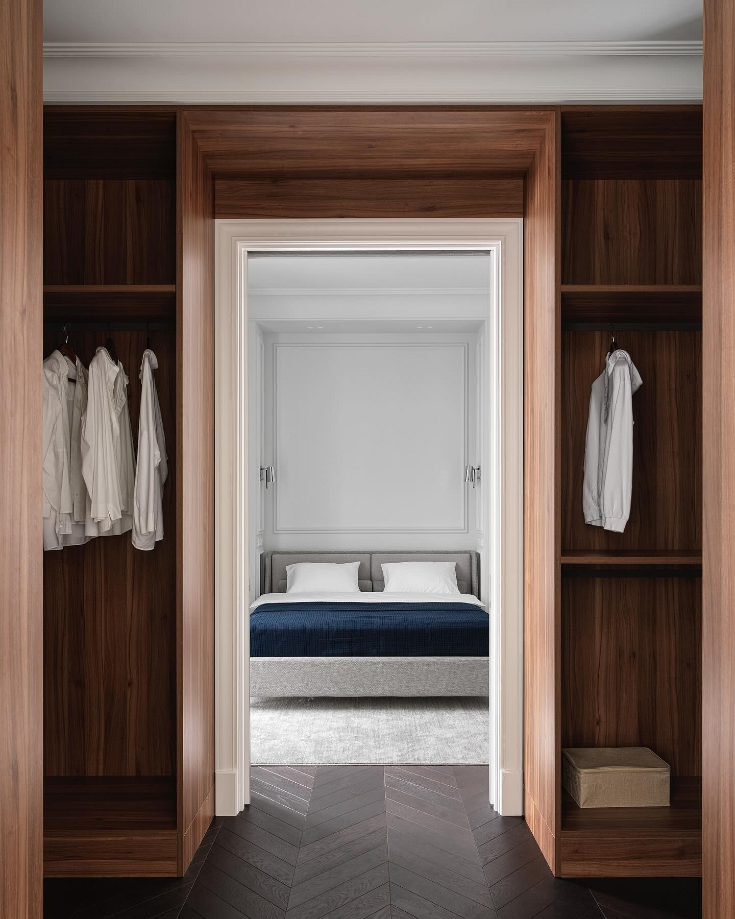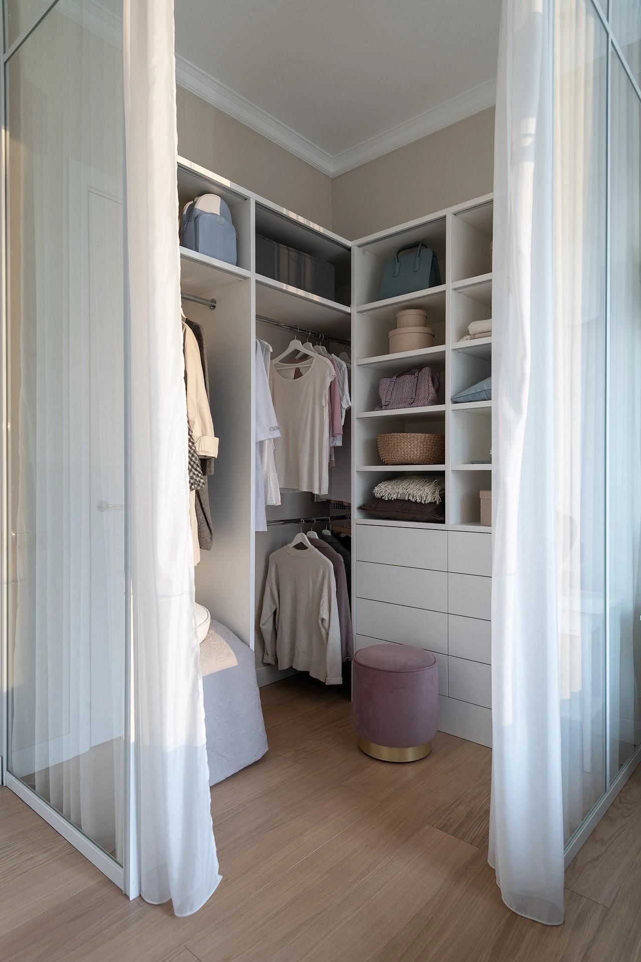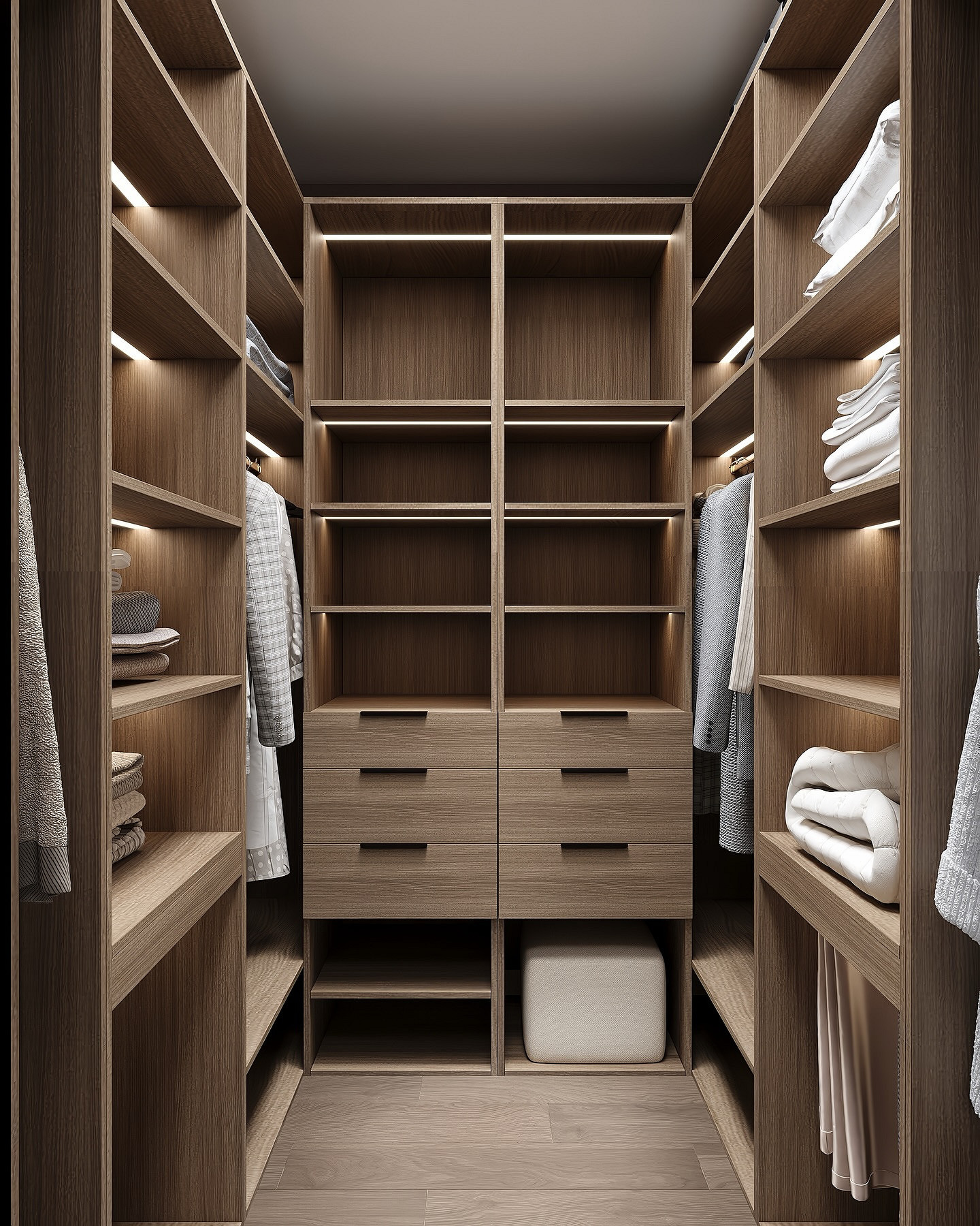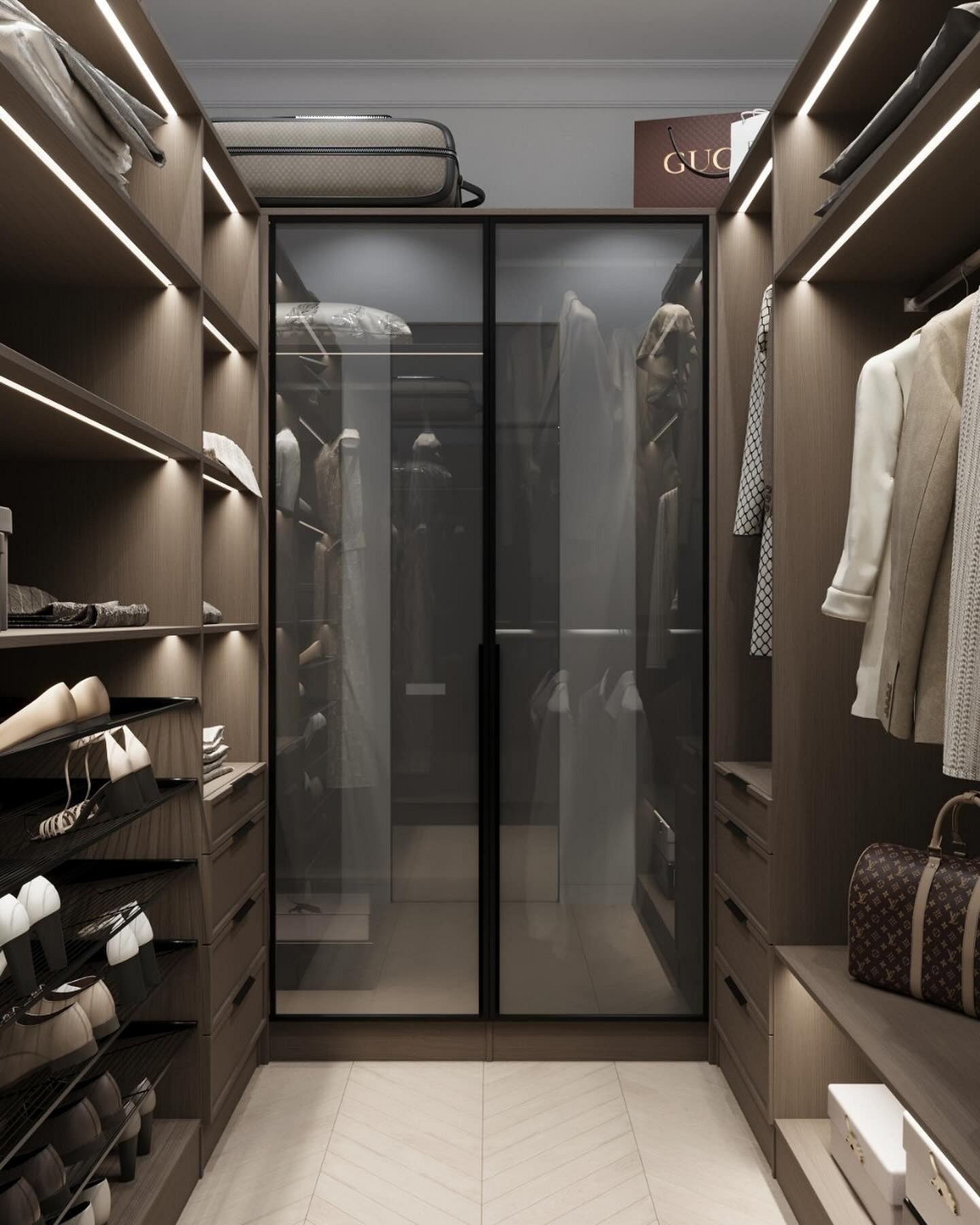 Форма гардеробной зависит от площади и расположения дверного проема. Правильная геометрия помогает задействовать все зоны и логично организовать хранение.