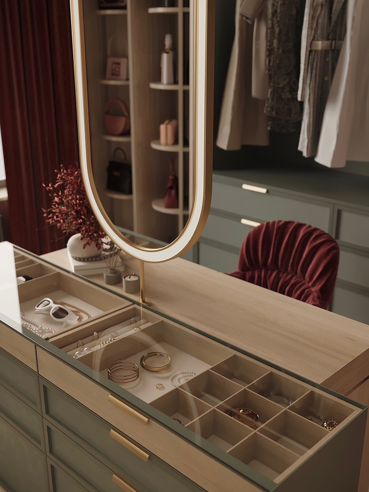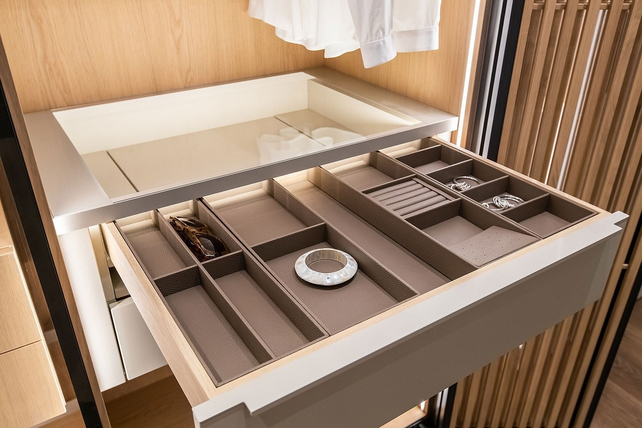 - Для мелких предметов идеально подходят скрытые выдвижные ящики с разделителями. В них можно хранить часы, ремни, галстуки и украшения, используя бархатные или кожаные вставки для защиты от царапин.