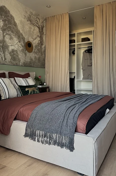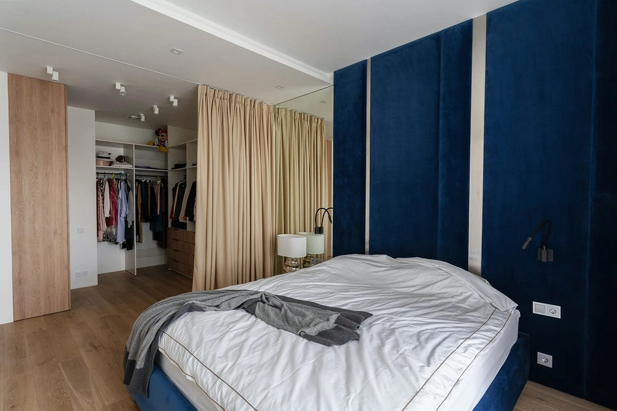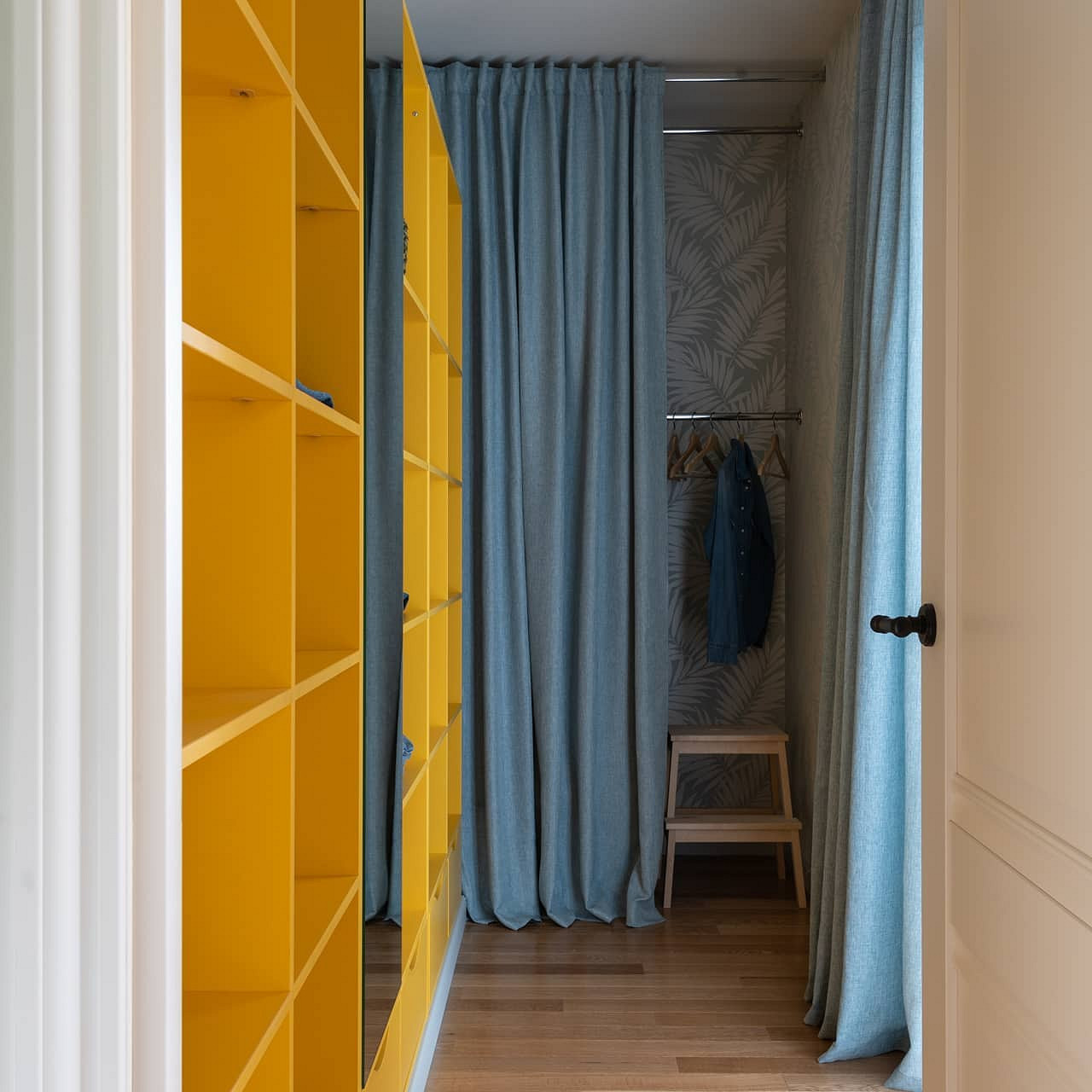 - Штора вместо двери. Текстиль добавляет комнате уюта, позволяет сэкономить место и бюджет. Плотная штора из качественной ткани может быть в тон отделке или, наоборот, акцентной. При необходимости ее легко постирать или заменить.