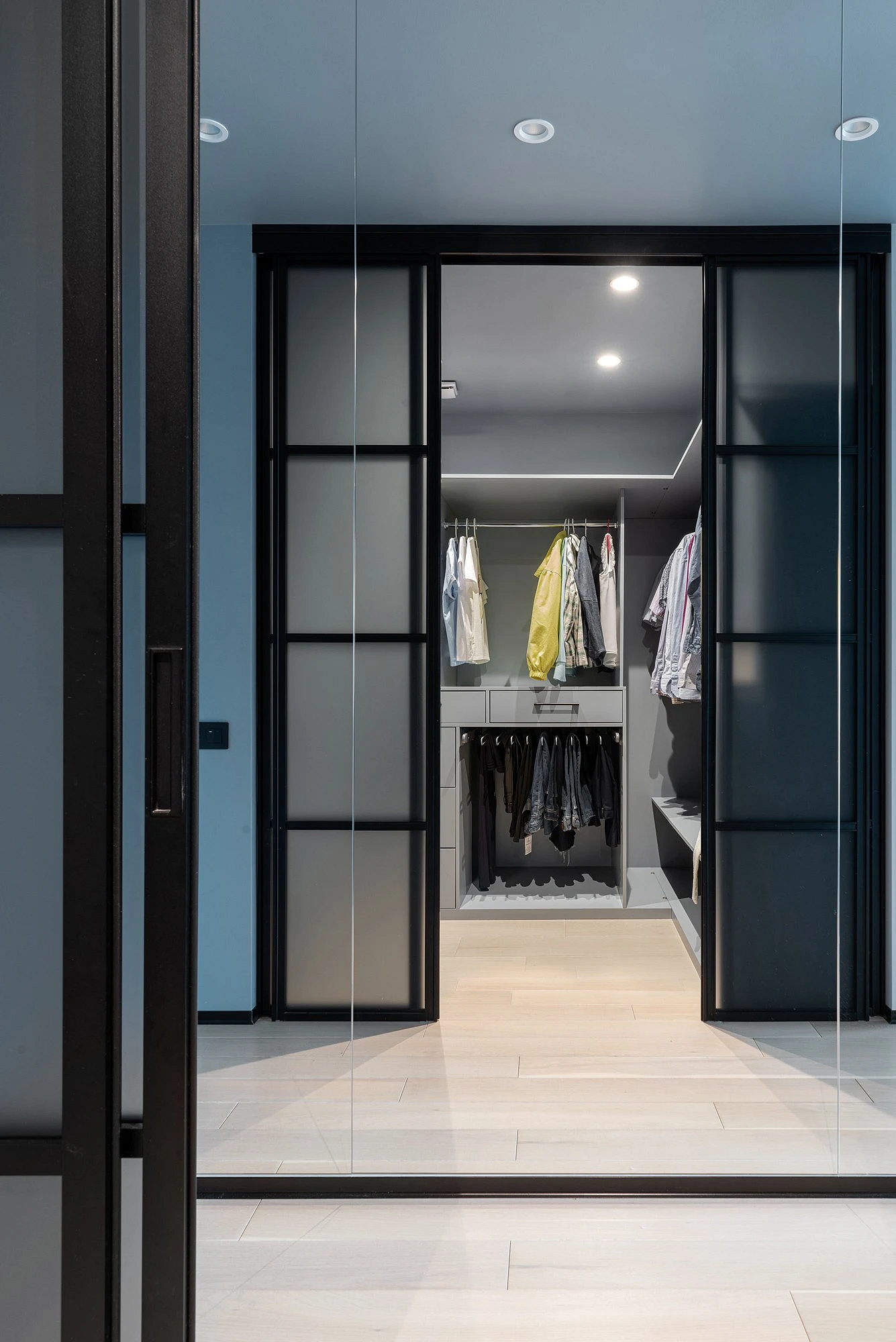 - Стеклянные фасады. Прозрачное или тонированное стекло в тонком профиле создает эффект премиального бутика. Такое решение визуально расширяет пространство и добавляет интерьеру глубины, особенно при наличии внутренней подсветки полок. Но важно понимать, что за стеклянными фасадами нужен постоянный уход и без тонировки все содержимое будет на виду.