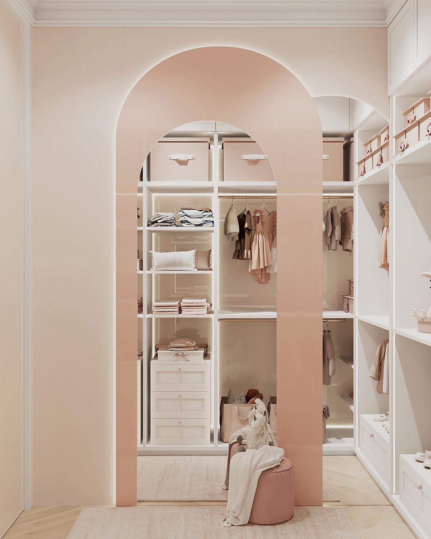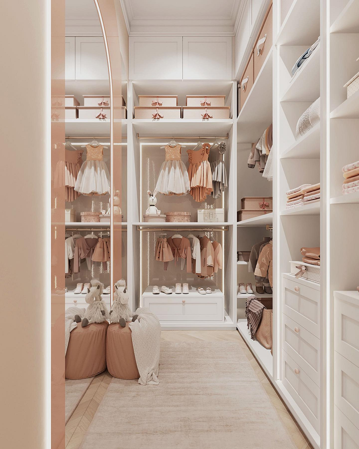 Детскую гардеробную оформляют преимущественно в светлых оттенках. Отдельное внимание стоит уделить декорированию, которое превратит процесс сборов и наведения порядков в увлекательную игру. Для детей постарше подойдет более сдержанное оформление с акцентом на функциональность.