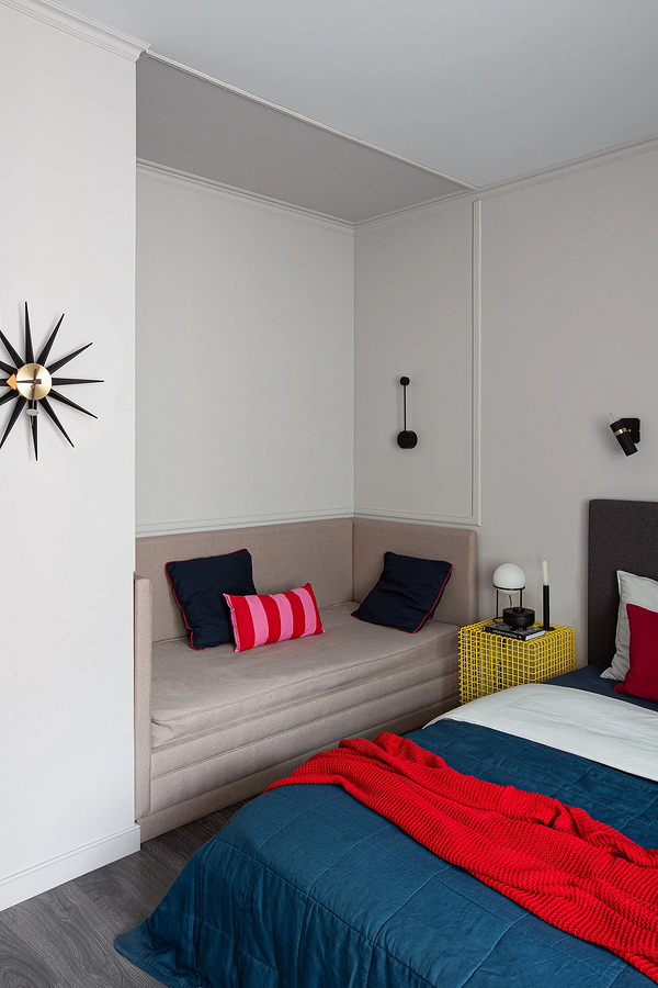 Если в комнате предусмотрена ниша, установите в ней диван «от стены до стены». Такое расположение создает эффект встроенной мебели, а также освобождает центральную часть комнаты. Нишу можно дополнительно подчеркнуть цветом или подсветкой, превратив зону отдыха в уютный «кокон». Для удобства купите складной или просто небольшой журнальный столик либо используйте вместо него прикроватную тумбочку.