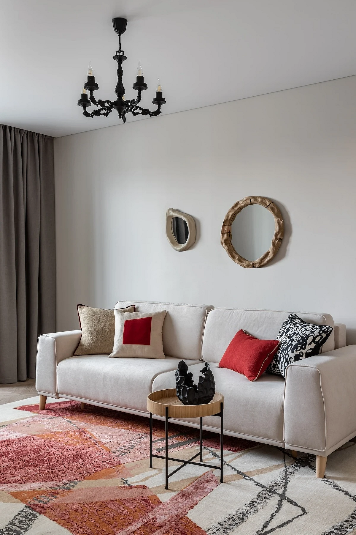 Текстиль в гостиной должен быть не только качественным, но и всегда чистым, опрятным. Потрепанные диванные подушки или старый плед в катышках могут испортить самый продуманный интерьер. Если вы решитесь на ковер — следите за тем, чтобы он был идеально чистым всегда.