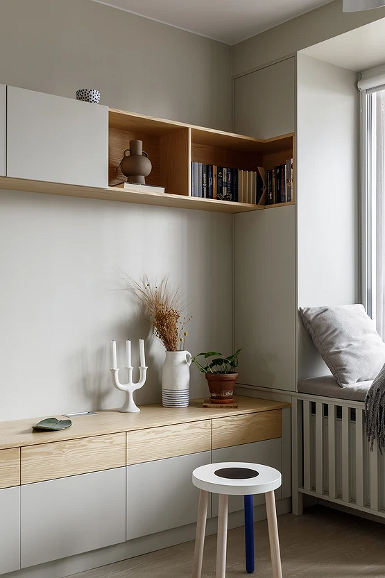 Следите за тем, чтобы визуальный шум не портил обстановку. Продумайте системы хранения: красивые полки, встроенные шкафы, витрины. По большей части делайте их закрытыми. Вещи в дорогом интерьере лежат на своих местах, а не валяются где попало. И неважно, какой площади комната: например, в этой студии дизайнер организовал несколько удобных систем хранения.