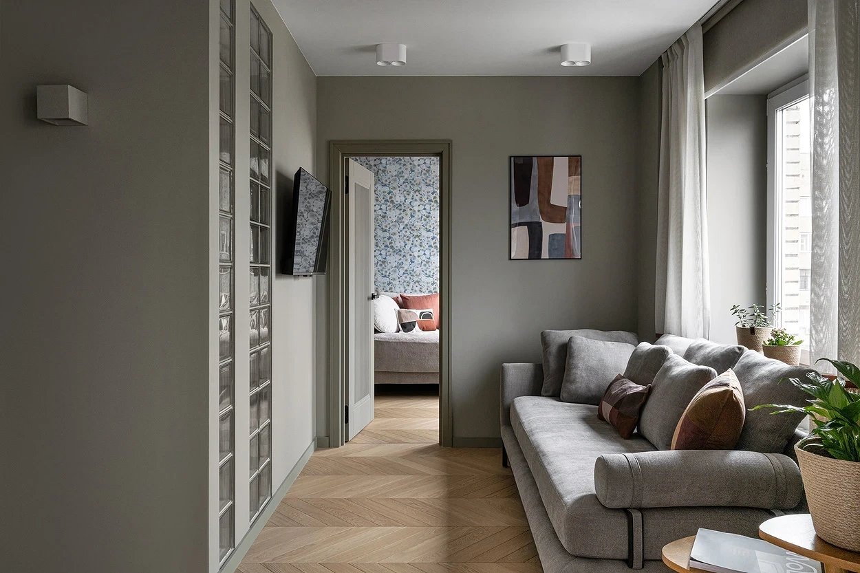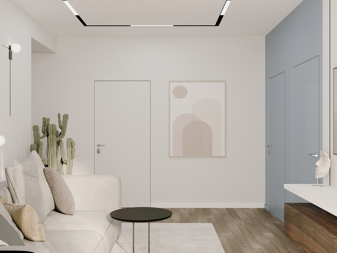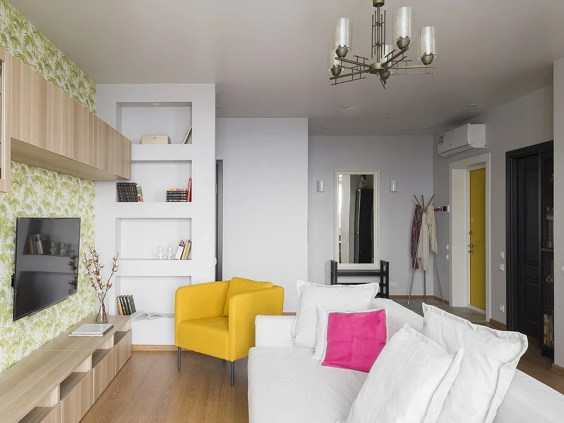 Лучшим решением будет минималистичный дизайн проходной комнаты-гостиной. Благодаря характерному для минимализма малому количеству вещей, пастельным тонам и отсутствию броского декора в помещении сразу станет больше света и воздуха, даже если по метражу оно совсем маленькое. А чтобы обстановка не выглядела пресной и обезличенной, достаточно подобрать 1-2 выразительных, но при этом лаконичных аксессуара.