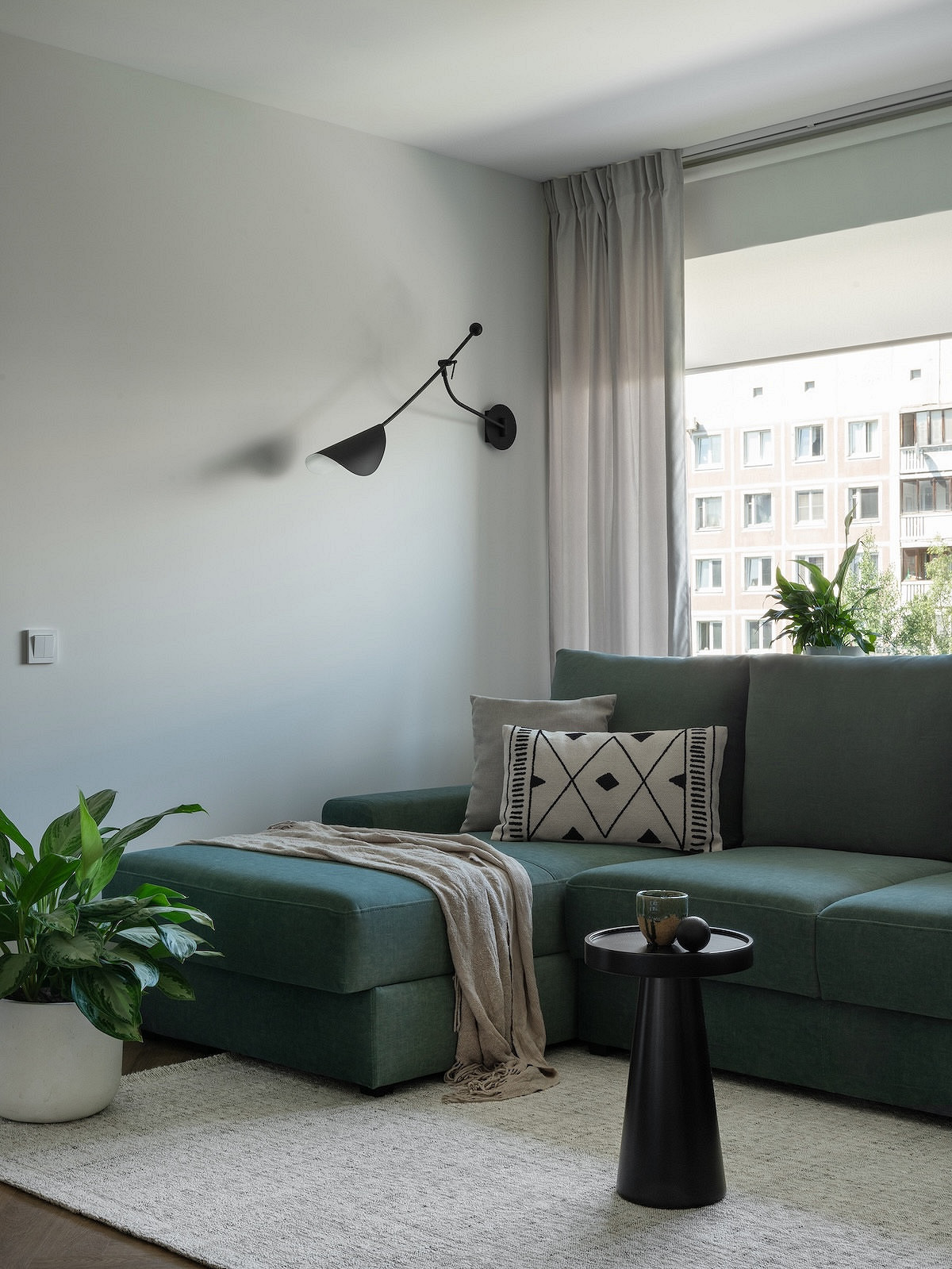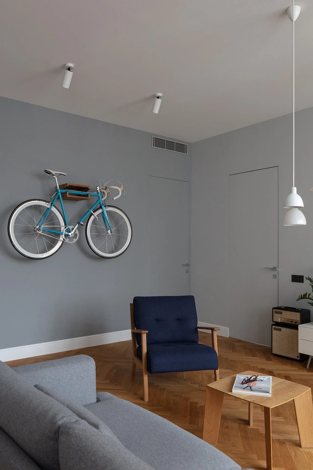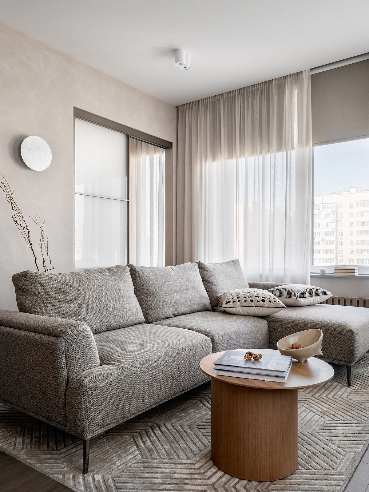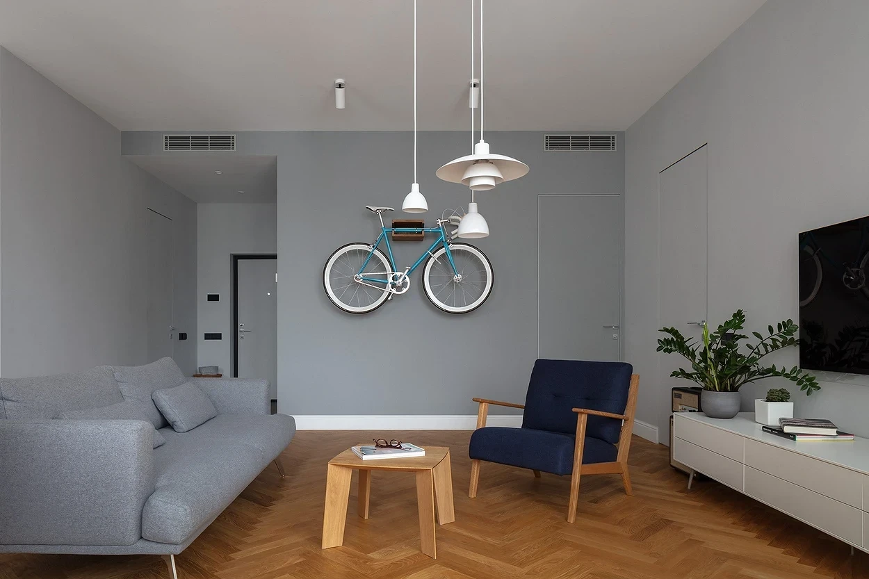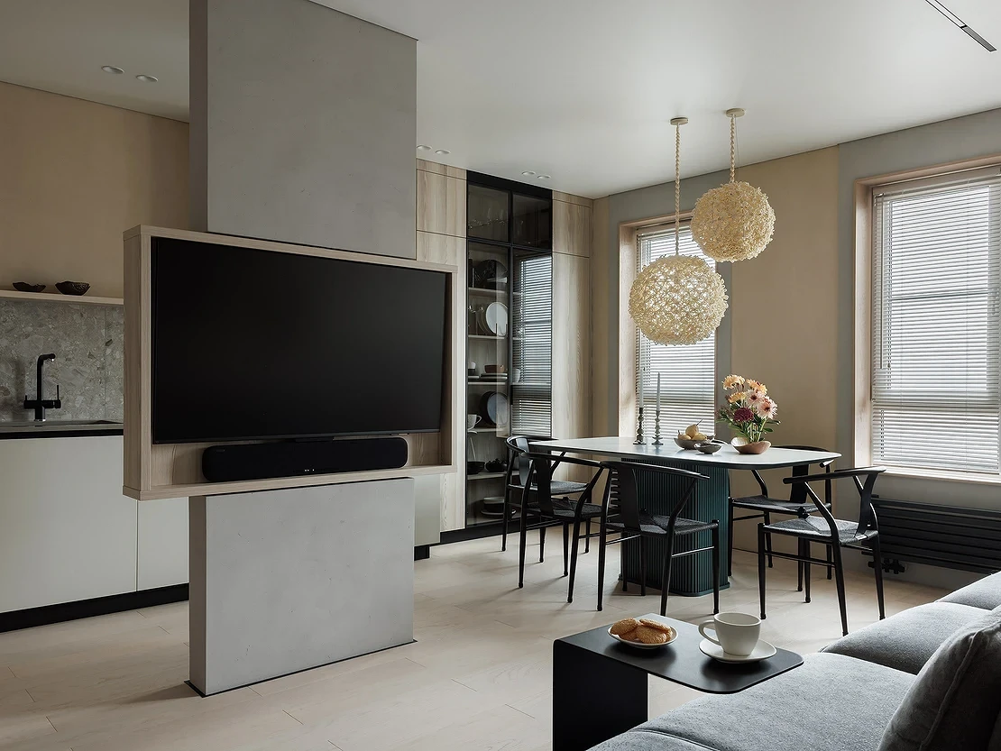 Скандинавский стиль также легко справится с задачей превращения тесной гостиной с несколькими дверями в уютное свободное пространство, где с комфортом разместится вся семья. Иллюзия большей площади создается за счет относительно светлых нейтральных оттенков серого и бежевого, а удобство достигается тщательной продуманностью каждой детали — мебель и техника занимают минимум места, но при этом они многофункциональны.