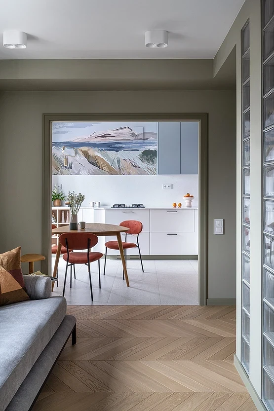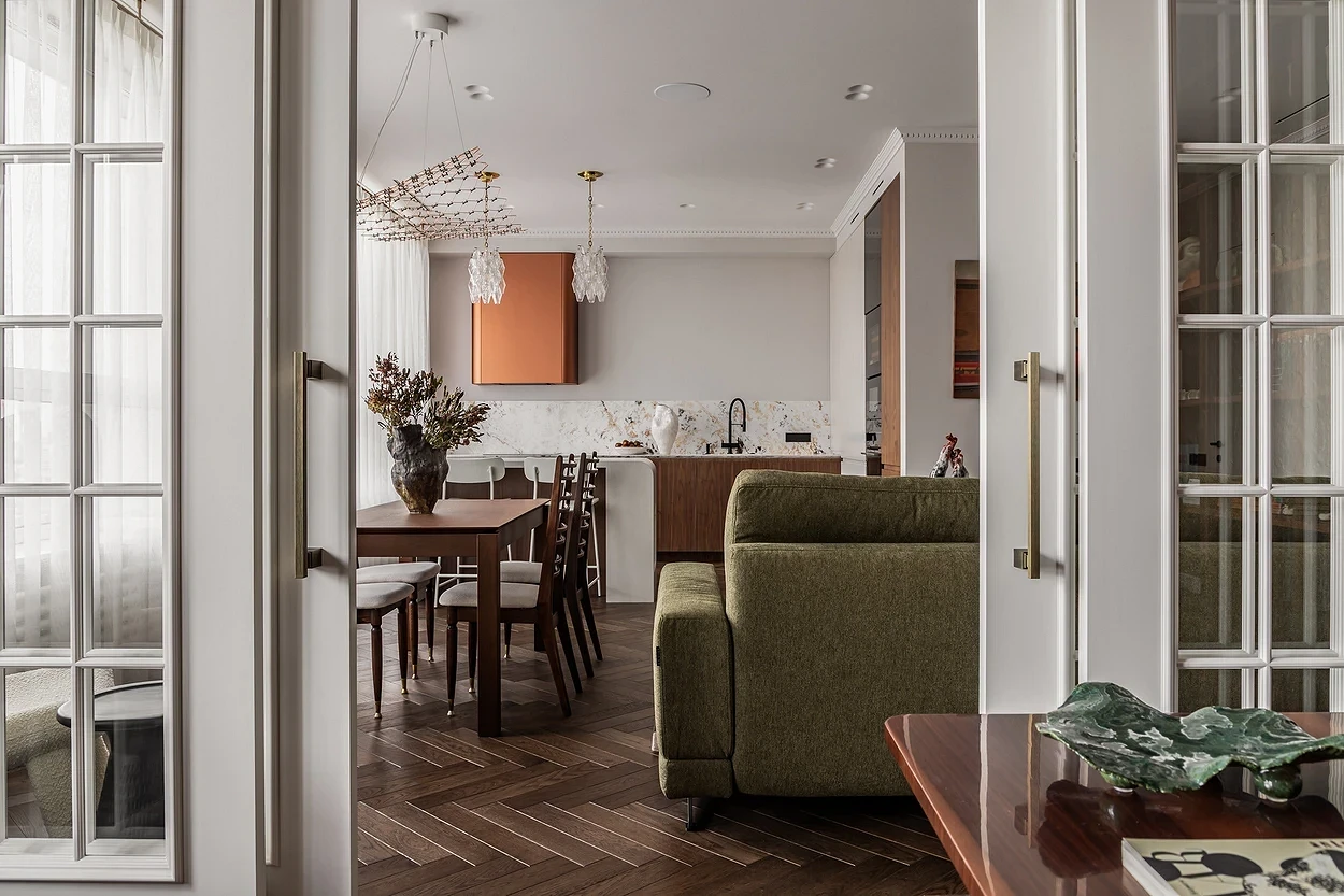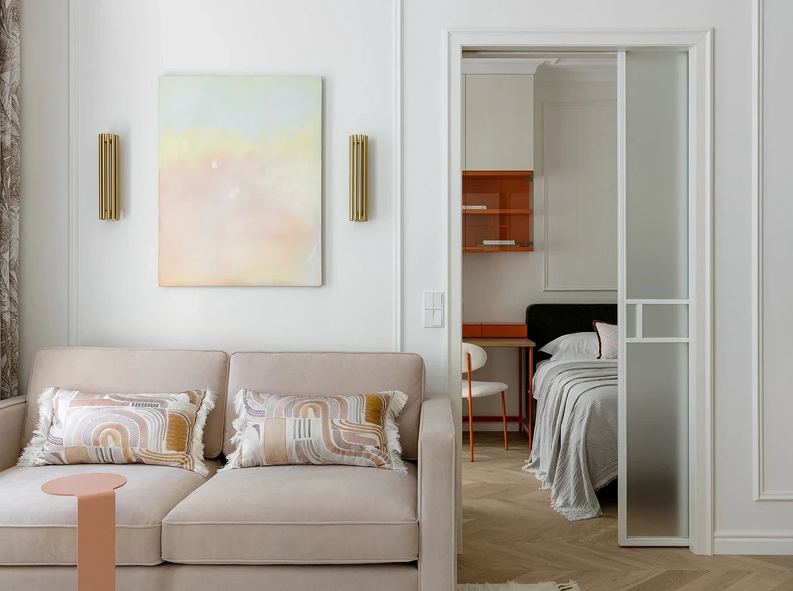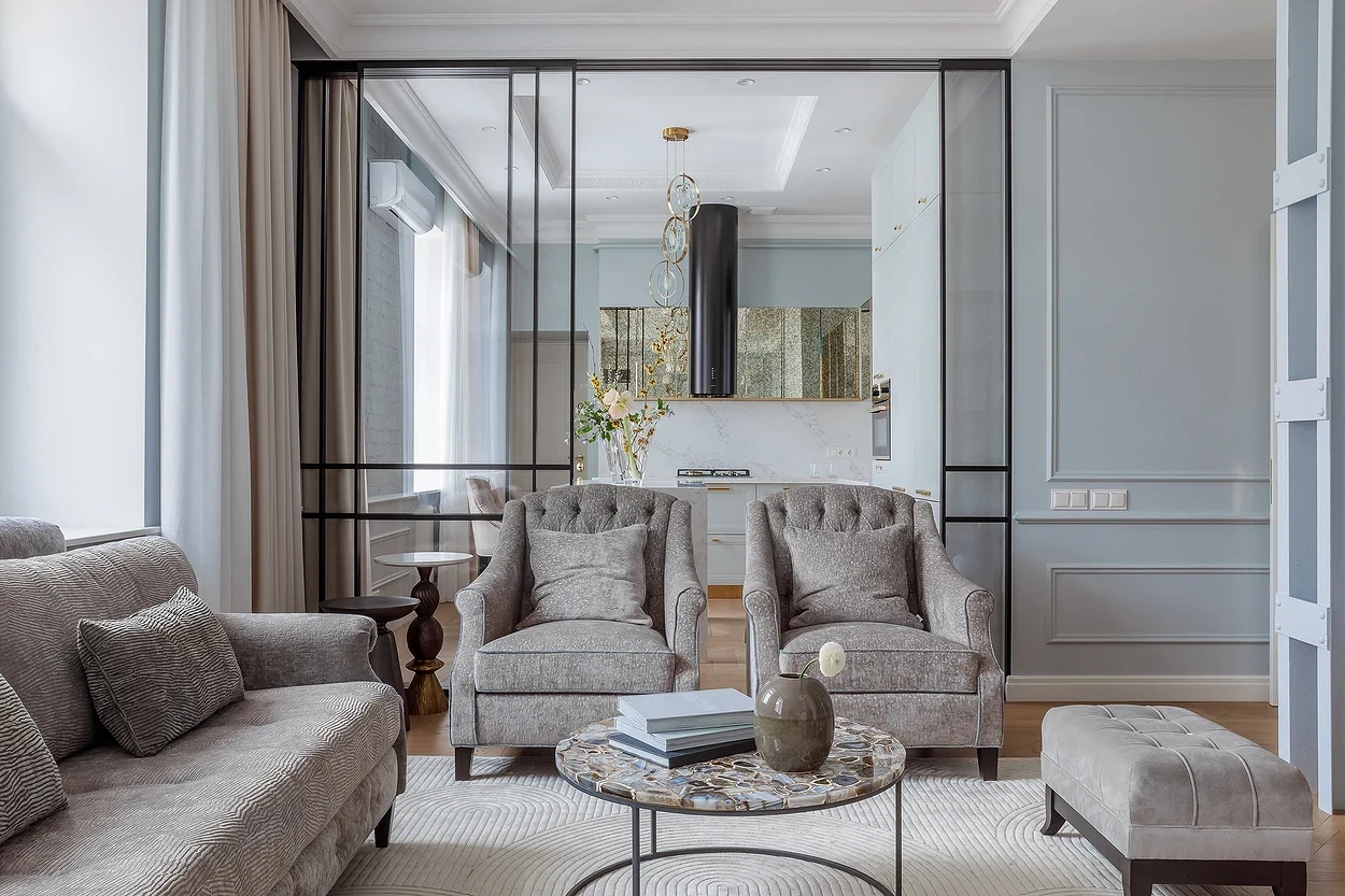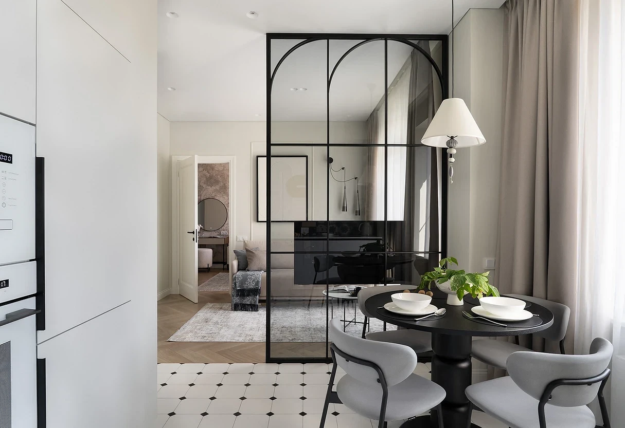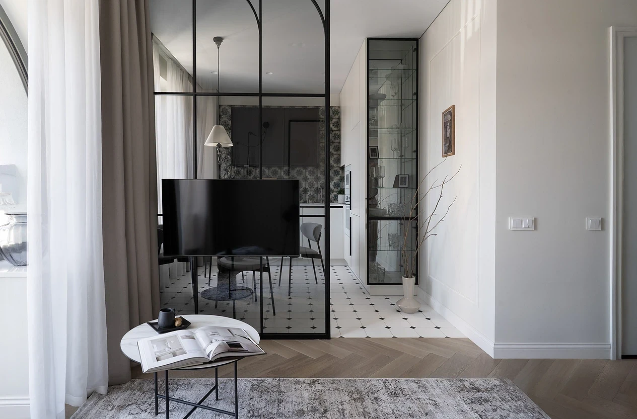 Если нет возможности или желания убирать стену, можно расширить дверные проемы и установить в них стеклянные двери или перегородки либо заменить их арками. Чем больше они будут, тем более просторной будет казаться гостиная. Такой прием сделает пространство более открытым и гостеприимным, но в то же время обеспечит некоторую приватность.