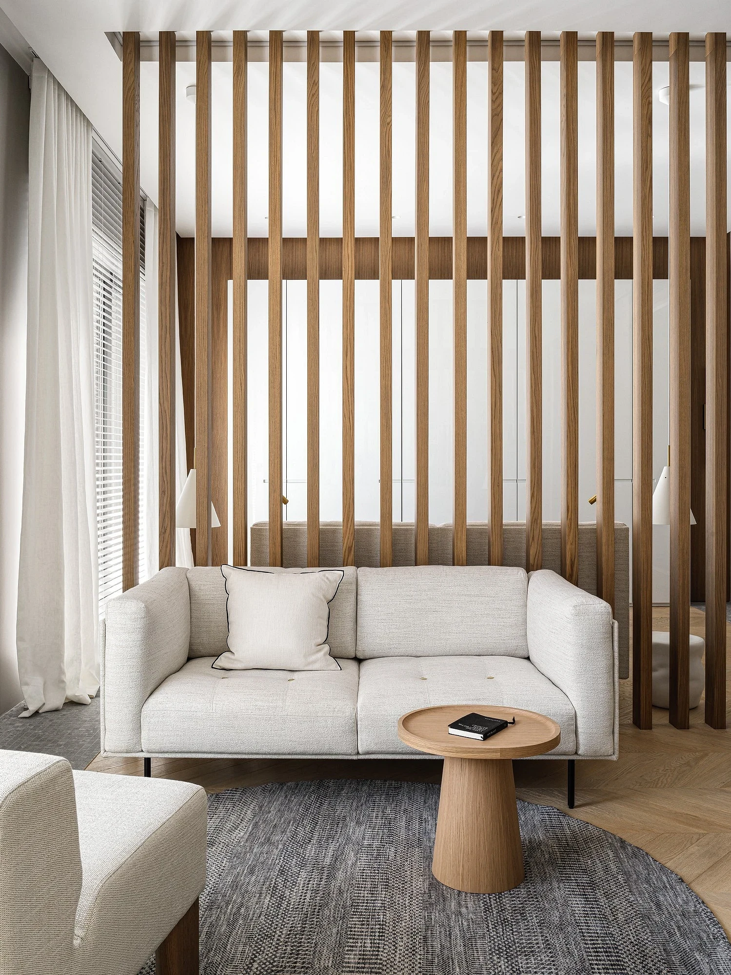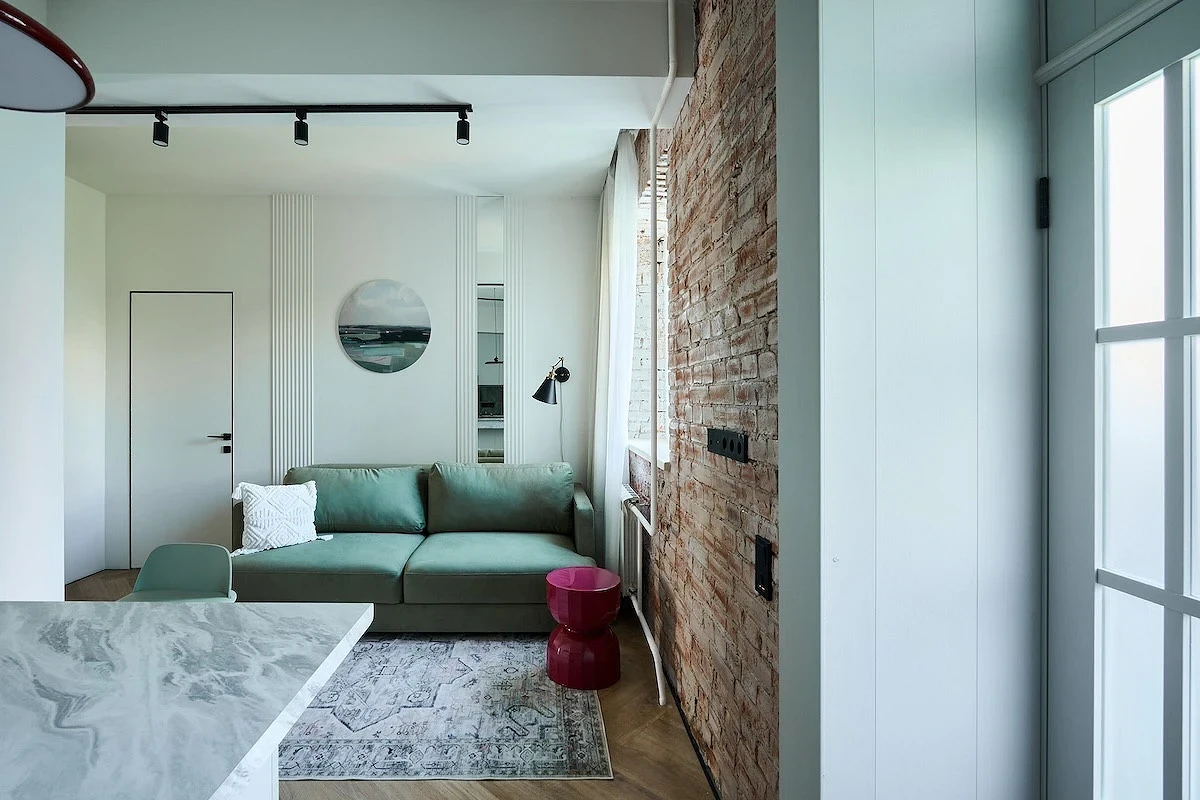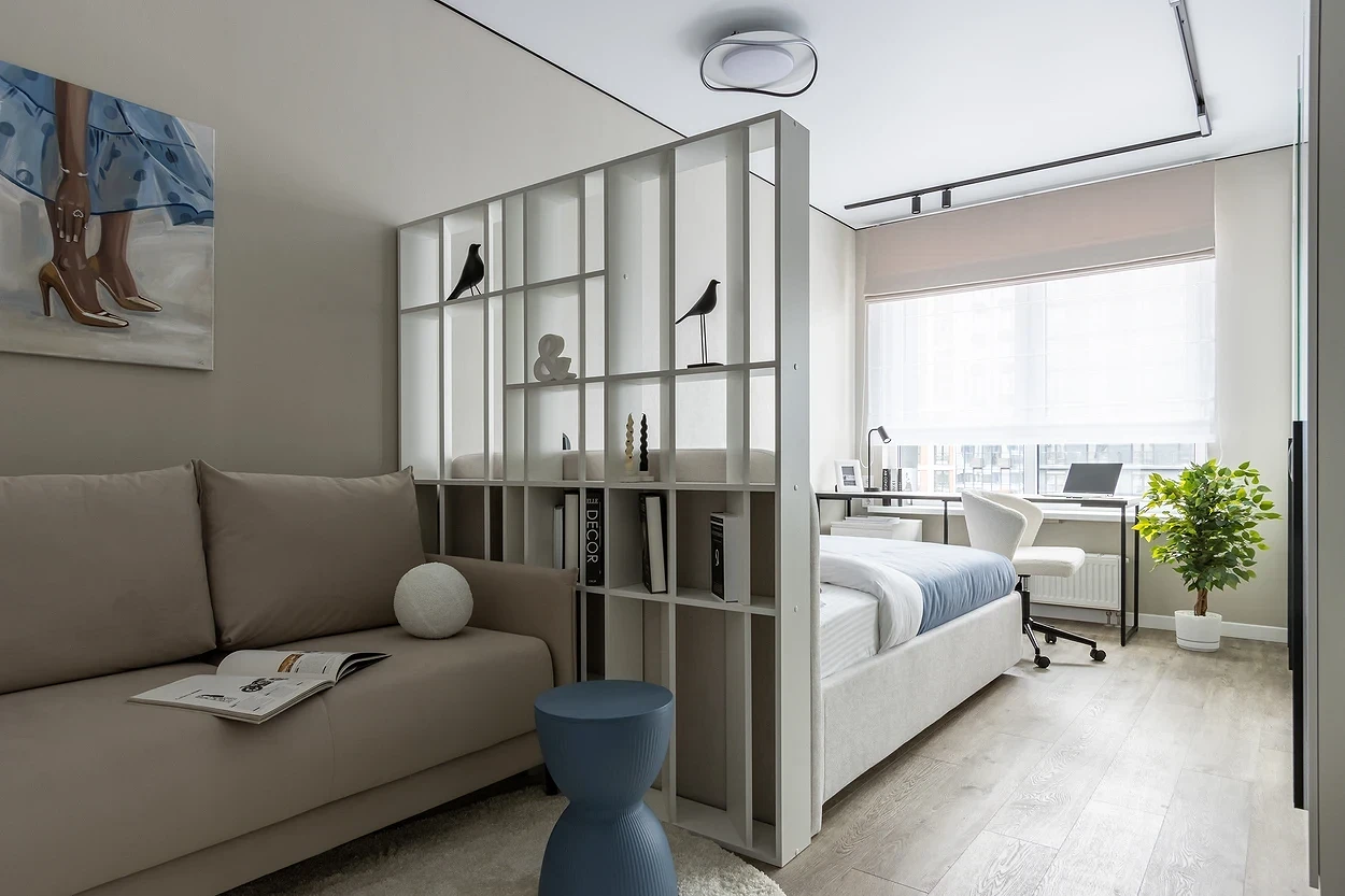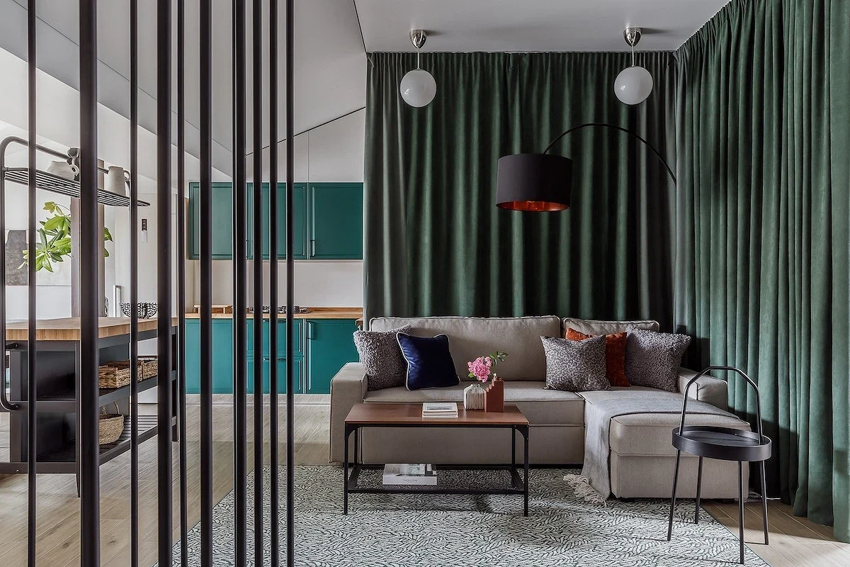 - Комната объединена с кухней, прихожей или рабочим кабинетом и требуется визуально разграничить их.