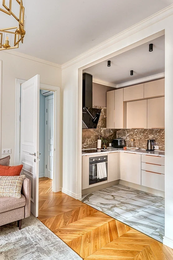 - Если помещение граничит с кухней, прихожей или коридором, можно объединить их, чтобы на увеличившейся площади создать максимально продуманное и комфортное пространство.