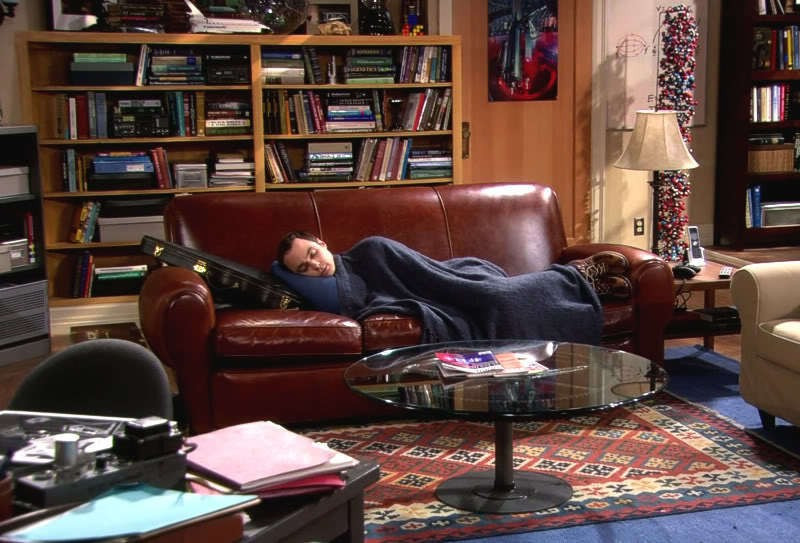 Интерьер гостиной в квартире Шелдона и Леонарда — главных героев популярного сериала — можно узнать по двум ключевым элементам: кожаному коричневому дивану и белому креслу. Они являются визитной карточкой гостиной. Так как в квартире живут ученые, в квартире стоят два вместительных стеллажа с книгами. А на полу диванной зоны лежит пестрый ковер. Разные детали кажутся несовместимыми, однако вместе составляют немного хаотичный, но уютный интерьер.