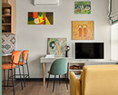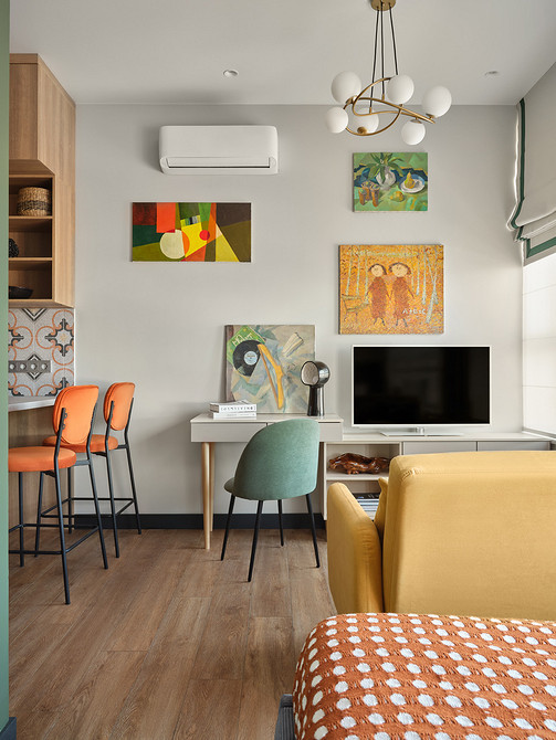 В этой яркой квартире для молодой пары по проекту Натальи Хохловой отлично продумано зонирование. На 30 квадратных метрах уместили все необходимое: кухню, гостиную, спальню, гардеробную, прихожую и ванную комнату. Кухня, гостиная и спальня расположены в общем пространстве без перегородок. Гостиная размещена, по сути, напротив спальни. А «разделителем» является диван, который стоит спинкой к кровати. Напротив дивана — тумба под телевизор и рабочее место.