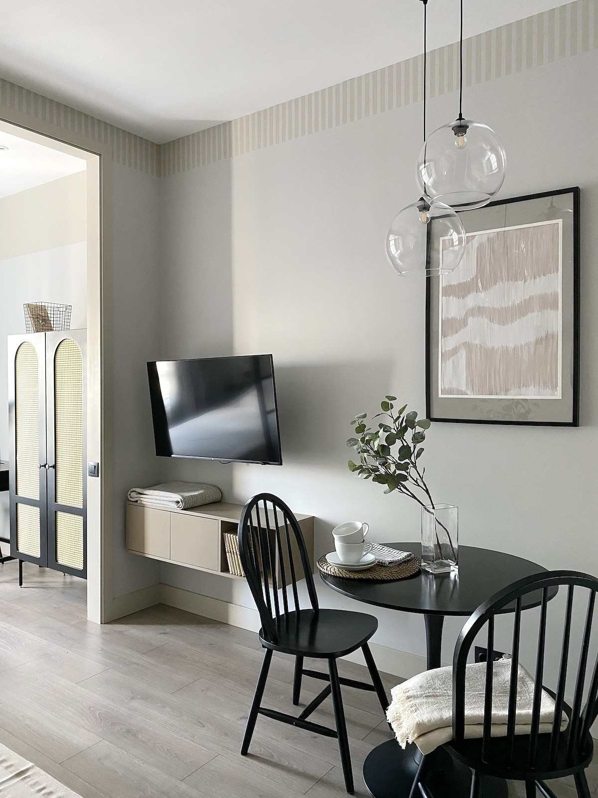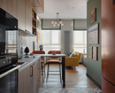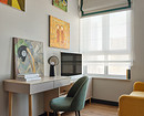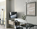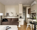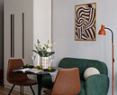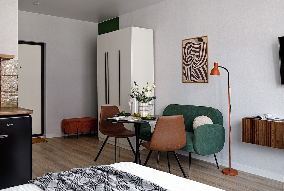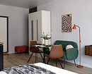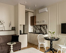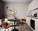 Эта студия предназначена для сдачи в долгосрочную аренду. На маленькой площади дизайнеру Наталье Верясовой удалось выделить (и даже сделать более приватной с помощью перегородки) спальню, организовать комфортную кухню и рабочее место. Рядом с кухней стоит маленький диван, там же расположена обеденная группа — столик и пара стульев. Обеденный стол легко придвинуть к дивану, чтобы сесть втроем.