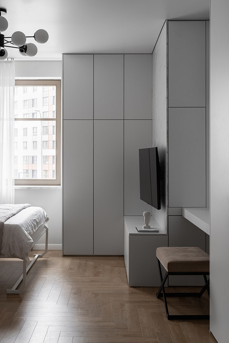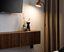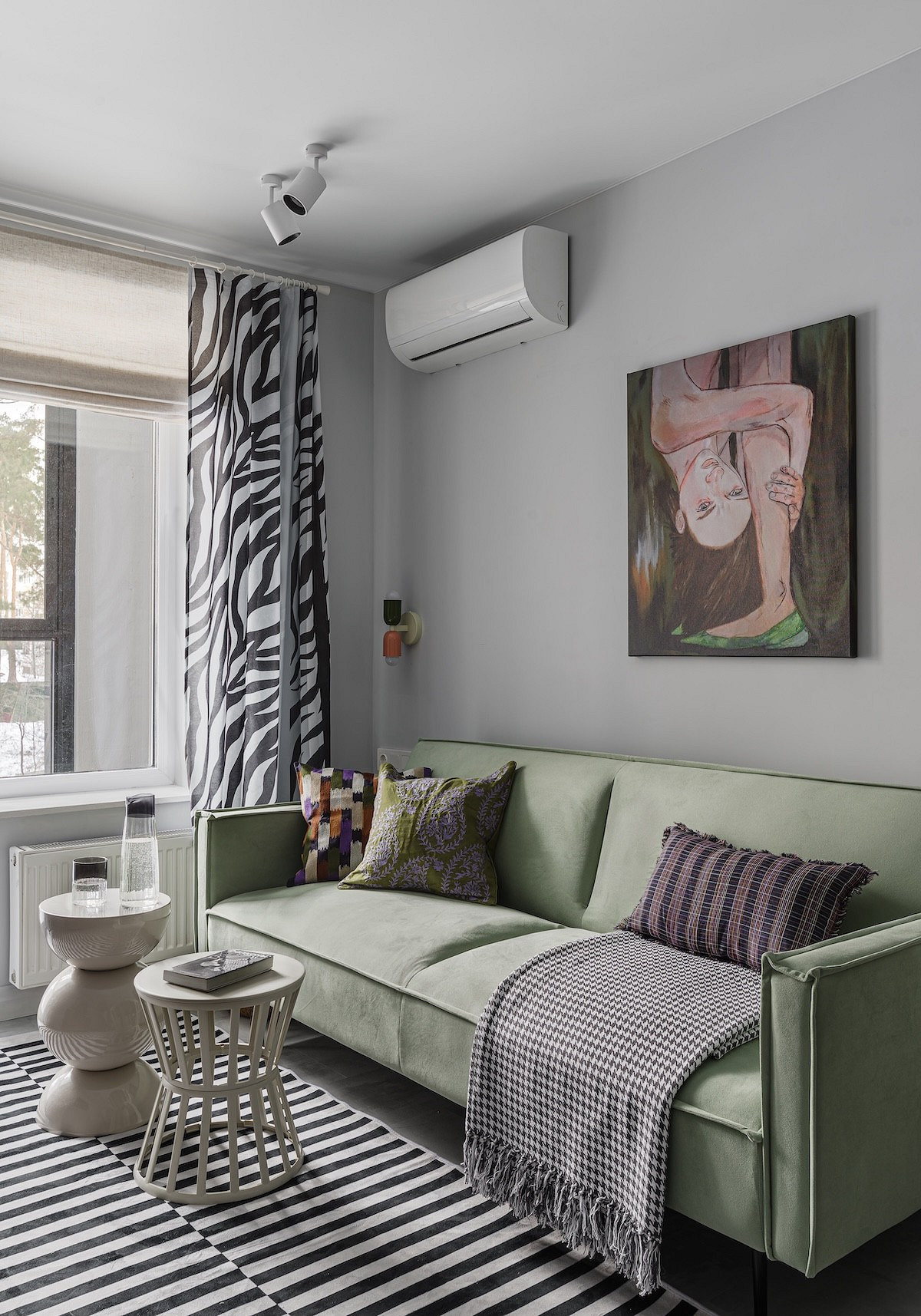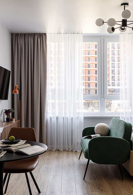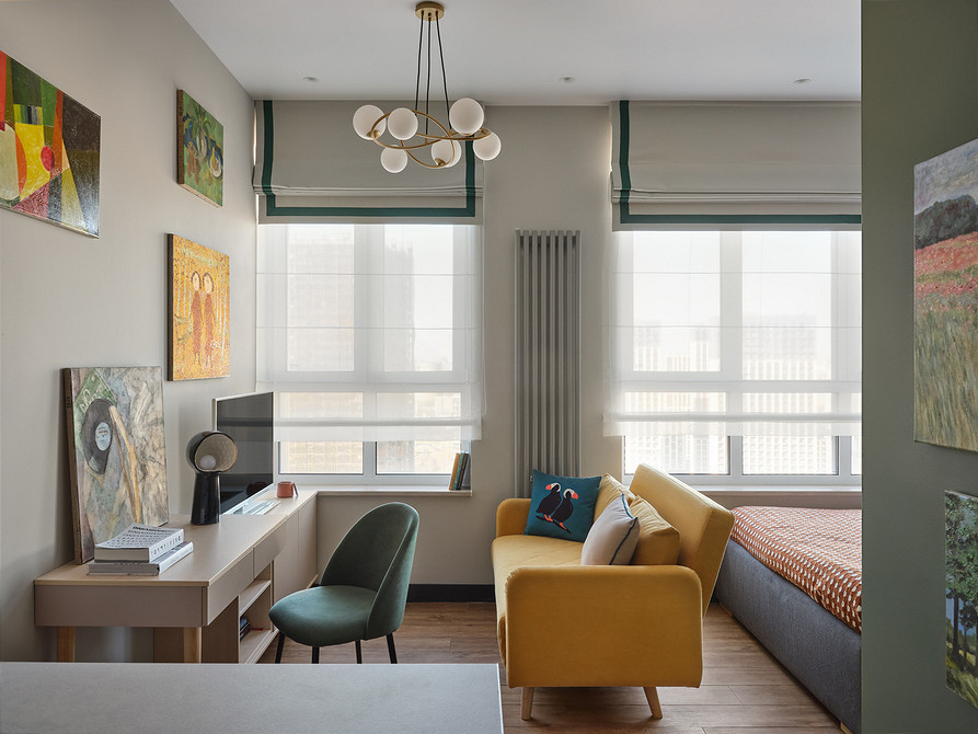 Тот самый очевидный вариант организации гостиной — выбрать раскладной диван вместо кровати. Тогда в дневное время будет комфортное место отдыха. А если выбрать диван, предназначенный для сна (сегодня выпускают разные модели, даже с ортопедическими «матрасами»), то и сон будет вполне комфортным. Не все дизайнеры предпочитают такой вариант, но в проекте Марии Саблиной — именно он. Эта студия предназначена для кратковременного пребывания семейной пары — на время приезда в город по выходным.