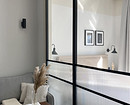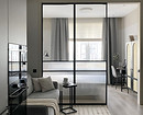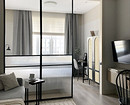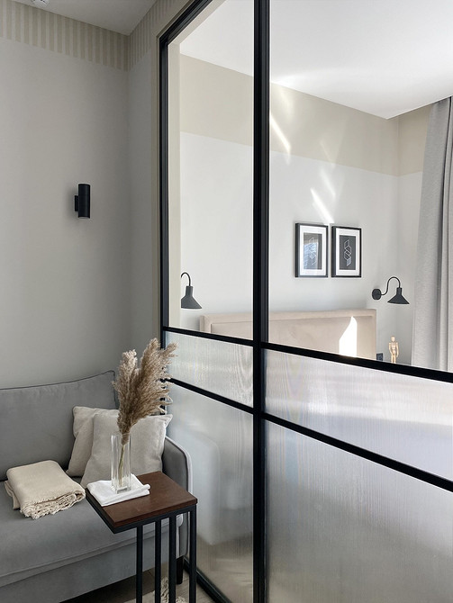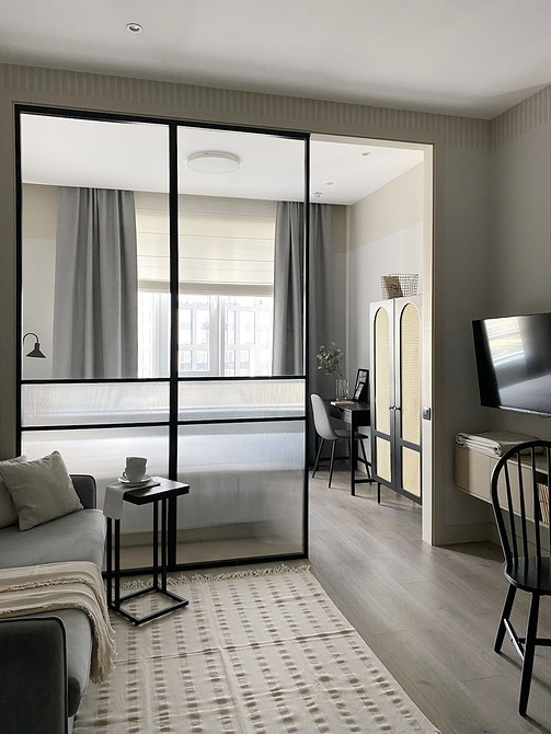 Эту студию дизайнер Ирина Сагун тоже обустраивала для аренды. Вытянутую комнату она предложила разделить с помощью стеклянной перегородки. У окна разместили спальню, а вторую часть «отдали» под кухню-гостиную. Благодаря тому, что перегородка сделана из стекла, естественный свет проникает и на кухню. Диван разместили в нише между перегородкой и кухонными колоннами со встроенной техникой. Напротив него — тумба и телевизор.