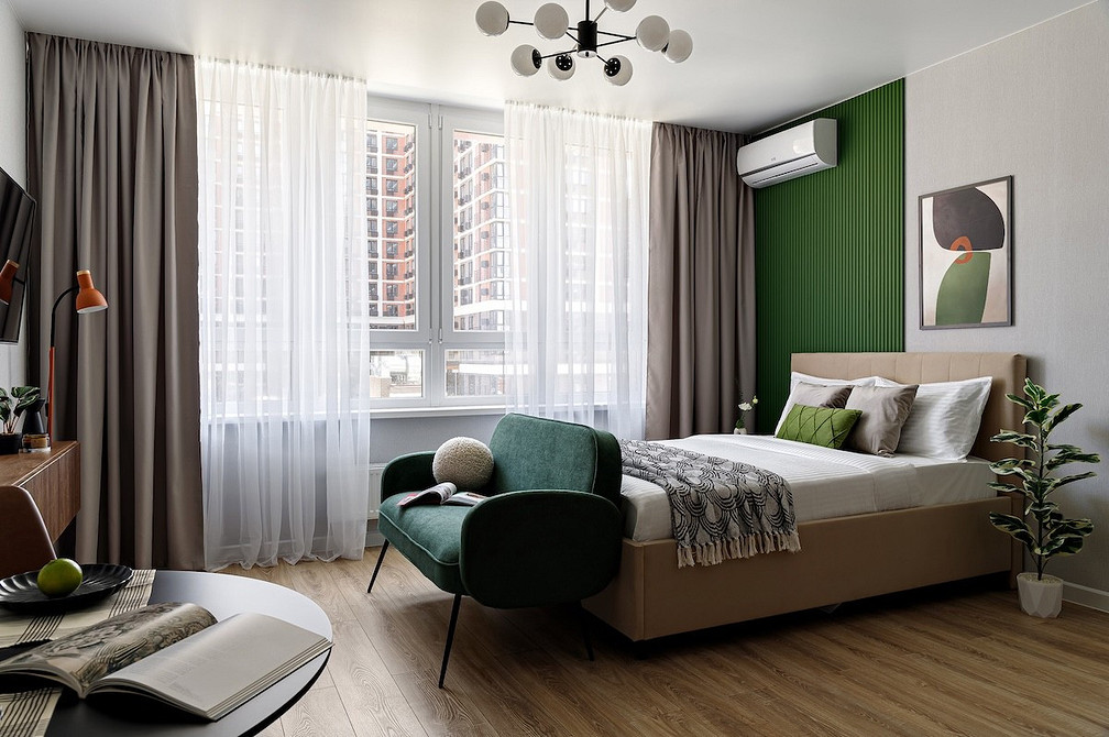 Маленькая квартира по проекту дизайнера Екатерины Шейн предназначена для сдачи в краткосрочную аренду. В таких интерьерах акцент всегда делается на спальном месте — ведь гостям важен именно комфортный отдых и сон. Однако Екатерине здесь удалось вписать и мини-диванчик. Он расположен в своеобразной нише между стеной и перегородкой, за которой размещена часть кухни (не плита или раковина, а зона хранения). Таким образом удалось создать уютный уголок, а еще — дополнительное спальное место.