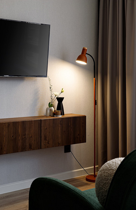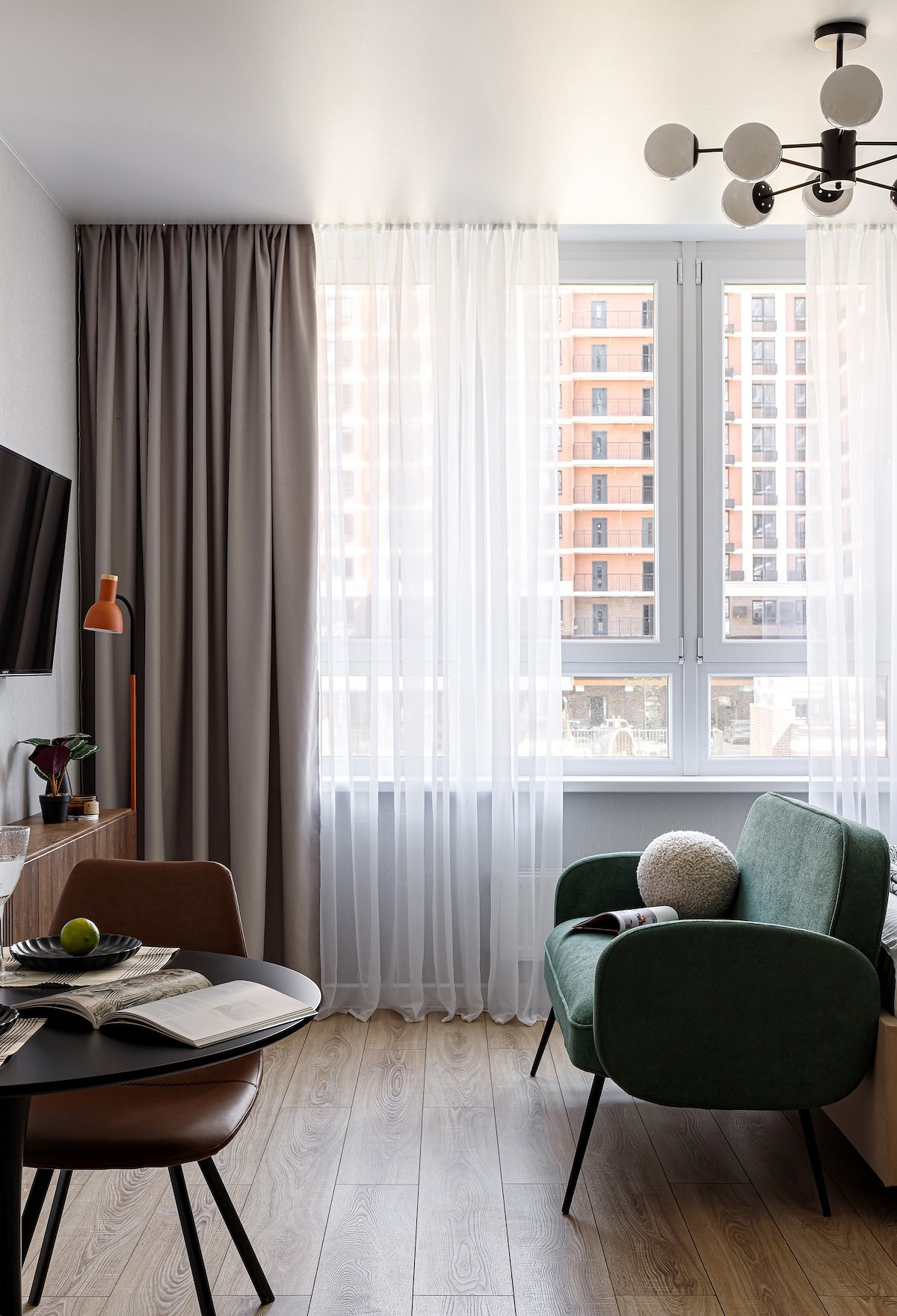 В квартире по проекту Анастасии Дубовсковой создан комфортный интерьер для краткосрочной аренды (квартиру хозяйка покупала на будущее для дочки, а пока она растет, решила сдавать). Из необходимого продумали все — кухню, спальное место, обеденную зону, хранение. А еще в студии есть компактный диванчик, который при желании несложно передвинуть: разместить в изножье кровати для просмотра ТВ или использования как банкетки, или поставить к столу, чтобы расширить обеденную зону.