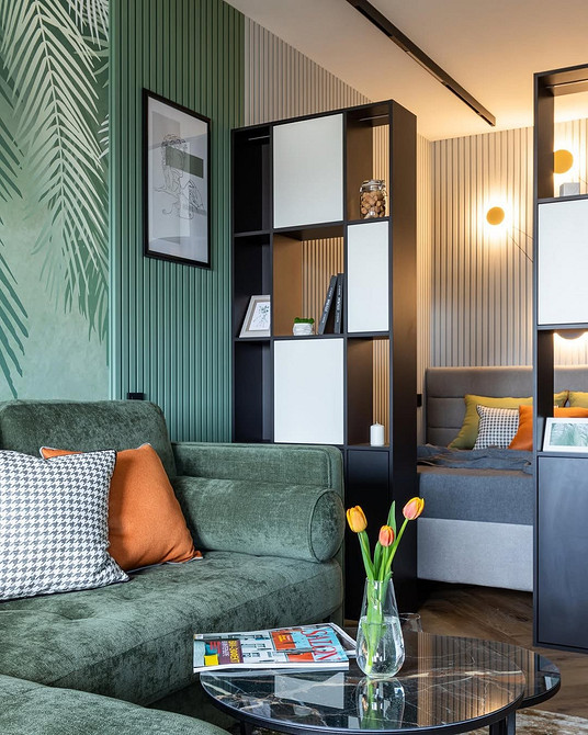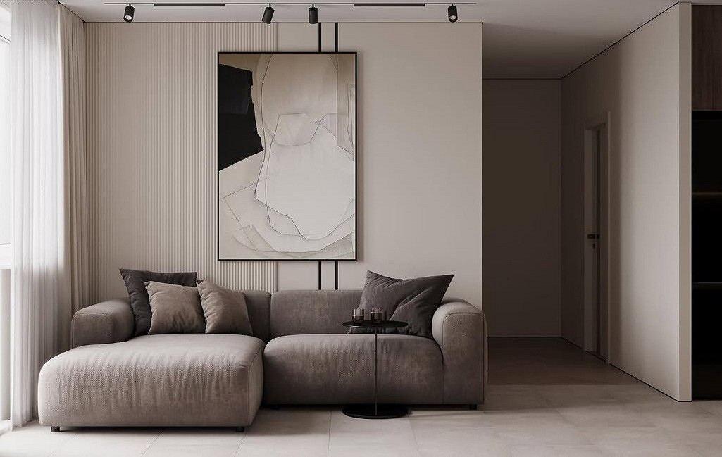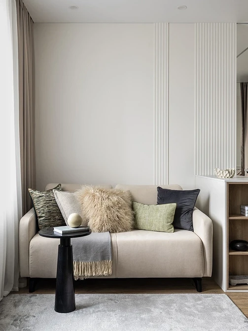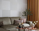 Главный элемент гостиной, безусловно, диван. И установка панелей непосредственно за ним — вполне логичное решение. Такое расположение красиво смотрится и зонирует пространство, выделяя мягкую мебель как место для отдыха и общения.