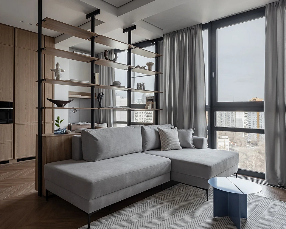 Стеллаж — функциональная замена перегородке. Он не только пропускает свет и воздух, но и увеличивает объем хранения. Подбирайте размер в зависимости от площади комнаты. Например, просторную гостиную можно разделить крупным стеллажом в ширину дивана, а высота до потолка только усилит эффект. Это создаст более приватную атмосферу в зоне отдыха, а сам разделитель станет чем-то вроде акцентной стены, если разместить на полках красивый декор. Помните про золотое правило: расставляйте предметы неплотно, чтобы между ними оставалось немного свободного пространства.