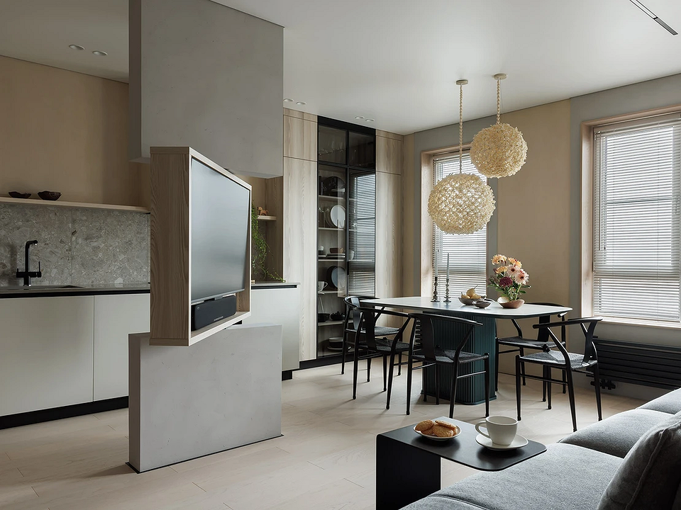 Если вы не боитесь сложных решений, возьмите на заметку идею из этого проекта. Просторную кухню-гостиную разделили конструкцией с поворотным механизмом для телевизора. Это позволяет смотреть фильмы как из зоны отдыха на диване, так и из-за стола. В то же время плоская колонная зрительно разграничивает части помещения. Реализация такой идеи требует точной проработки коммуникаций и надежного механизма — тогда результат не разочарует.