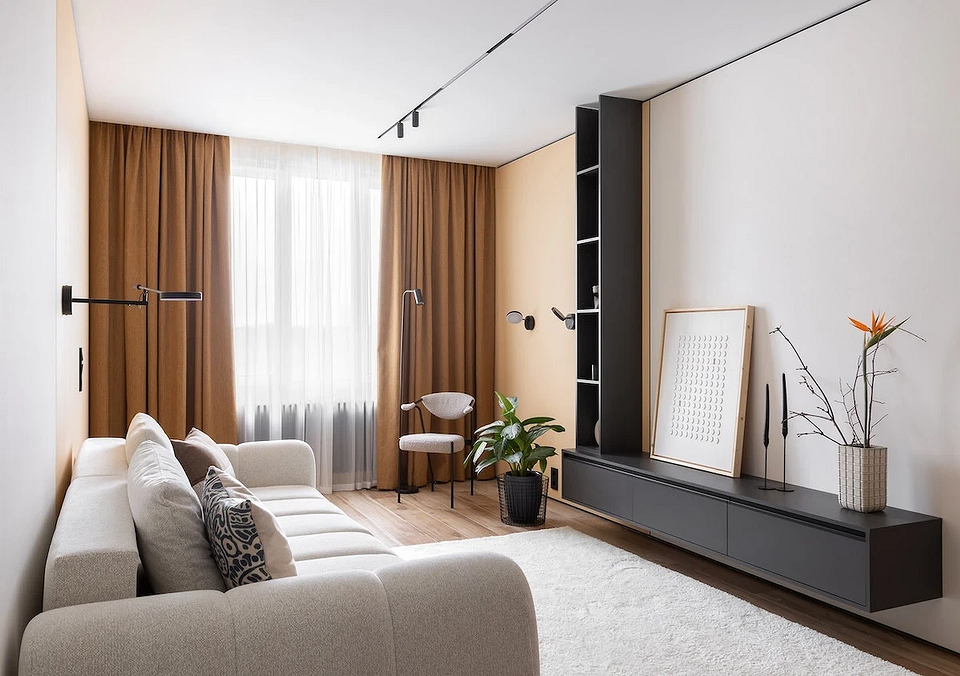 Необычный прием стоит взять на заметку из этого проекта. Вытянутная комната диктовала последовательное расположение зон, но дизайнер не просто расставила мебель вдоль стен. Напротив диванной группы разместили настенную систему хранения, напоминающую современную мебельную стенку. Контрастный цвет и наличие вертикалей превращают конструкцию в подобие рамы. Благодаря этому границы диванной зоны легко считываются, а эффект усиливают разные оттенки краски на стене.