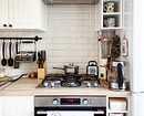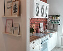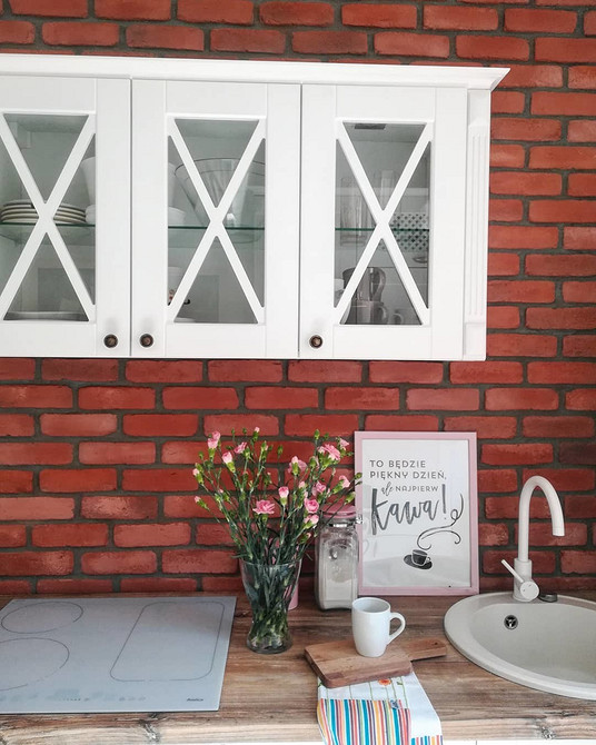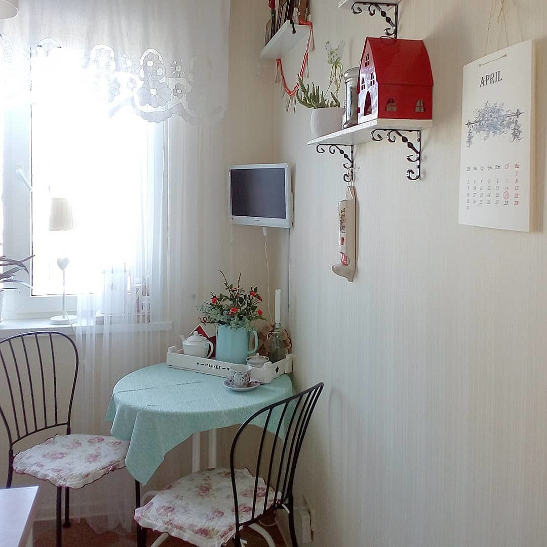 В этой небольшой квартире для кухни нашлось место в нише, поэтому владельцы выбрали линейную планировку. Кирпичная стена-фартук, а также милые аксессуары и декоративные стеклянные дверцы напоминают о стиле кантри, который больше характерен для загородных домов и дач. Такой выбор добавил кухне уюта. Хозяйка часто меняет аксессуары — выбирает разные горшочки для цветов на рейлинге, меняет текстиль и подбирает красивую посуду. Это помогает быстро изменить «настроение» в интерьере. Берите на заметку как быстрый и бюджетный способ добавить что-то новое!