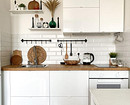 Белые глянцевые фасады без заметных ручек — идеальный вариант для компактной кухни. Так она кажется немного больше. Гарнитур на фото удачно вписался в небольшой простенок, которого оказалось достаточно для размещения всего необходимого. Чтобы увеличить места хранения, добавили небольшую секцию наверху, но сделали ее короче нижней — оставшееся пространство заполнили полками. Невстроенный холодильник (тоже белый) стоит слева от гарнитура. Микроволновка не встроена, но спрятана в одном из шкафчиков — никакого визуального шума за счет бюджетного решения.