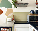 Эта небольшая кухонная зона, объединенная с обеденной, — часть кухни-гостиной. Г-образная модель состоит из 4 секций, наверху тоже разместилась пара шкафчиков, продолженная трехъярусной полкой. В углу столешницы, который не очень удобен для готовки, отведен под мелкую бытовую технику: невстроенную микроволновую печь, электрический чайник и кофемашину. Барная стойка выполняет роль обеденного стола и как бы завершает собой сам гарнитур, отделяя его при этом от зоны гостиной. Обратите внимание, что на фартуке — краска. Эта широкая полоса оливкового цвета выходит за границы гарнитура и становится частью минималистичной настенной росписи. Такой прием объединяет кухню и зону гостиной.