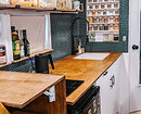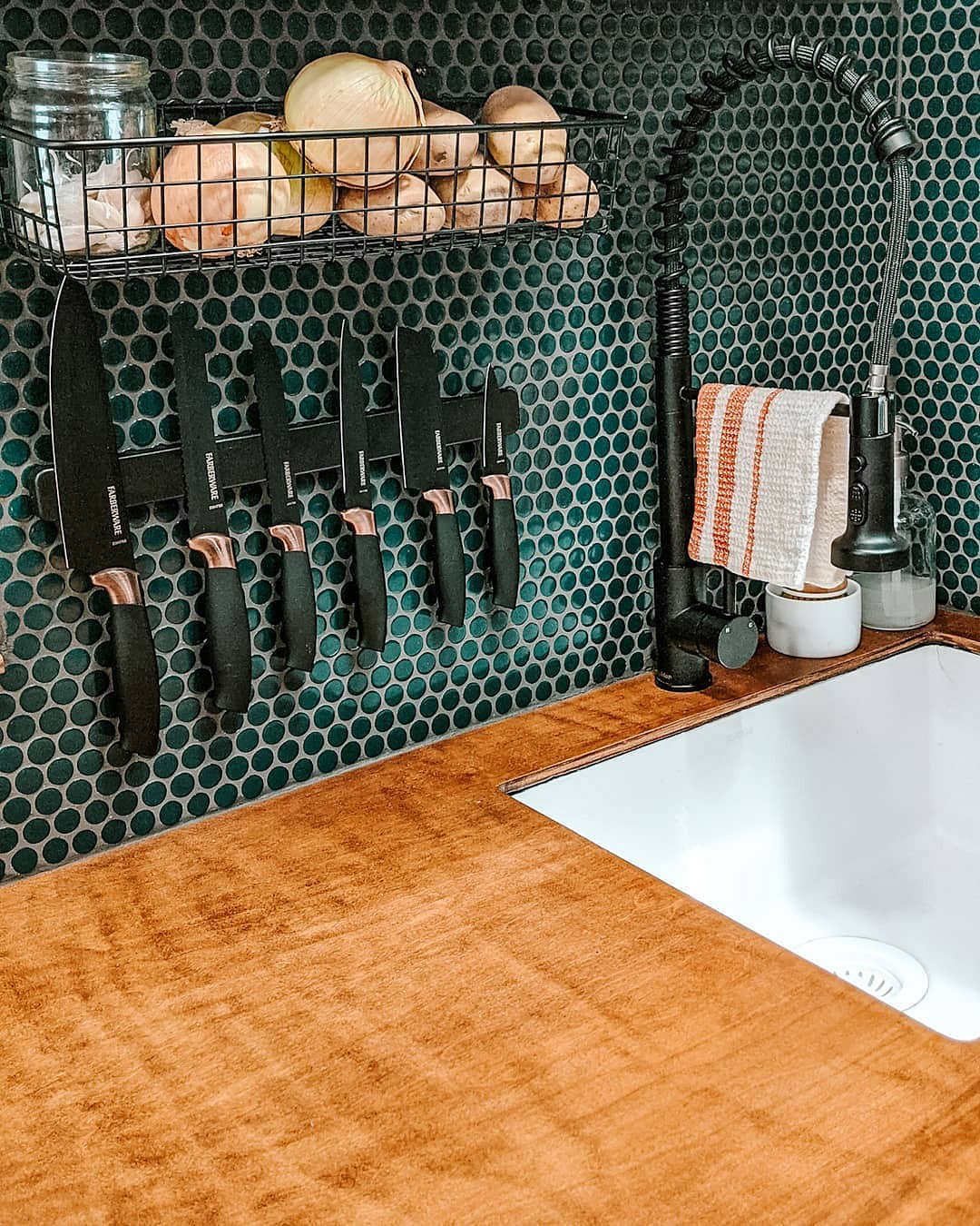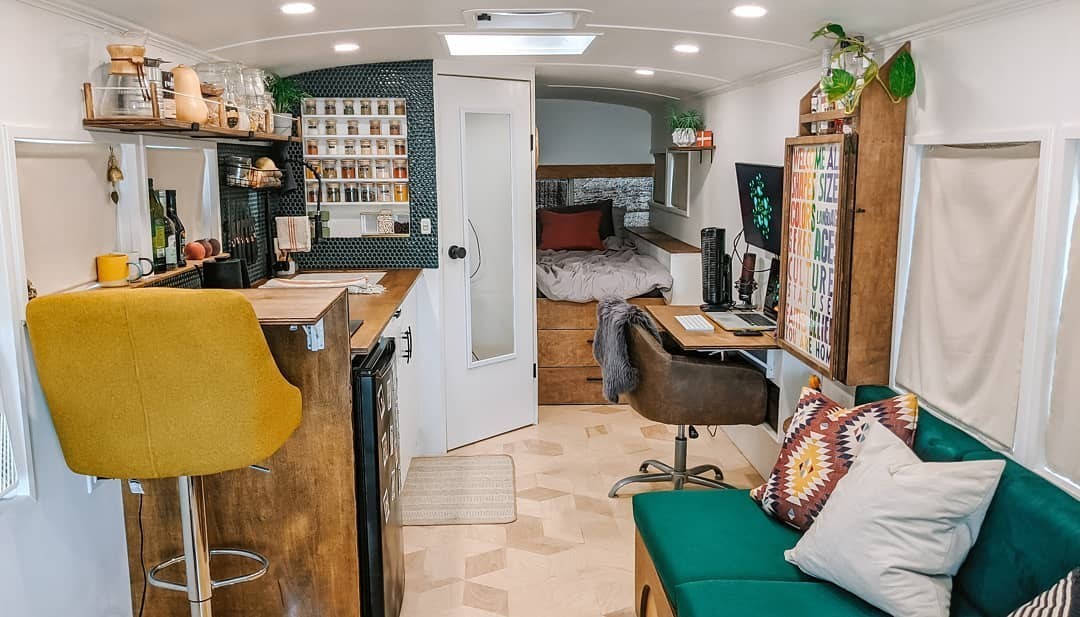 Увидев этот восхитительный фартук и продуманные идеи хранения, догадались ли бы вы, что это — бывший школьный автобус? Так и есть! Этот мини-гарнитур на 3 нешироких секции является частью общей комнаты, поэтому было важно сделать его маленьким, но практичным. Удивительно, что в эти 3 отсека вписался и холодильник — его просто поставили в свободную нишу под столешницей. При этом она сделана из фанеры, покрытой лаком — экономичное и стильное решение. Одинаковые баночки с сыпучими продуктами над мойкой и сбоку от нее не только делают процесс готовки удобным, но и добавляют необычному пространству поистине домашних уюта и продуманности.