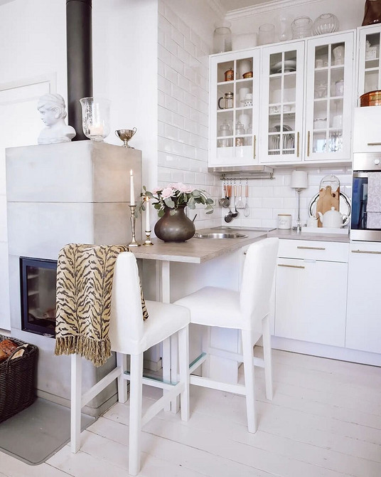 Эта миниатюрная кухня вписана в похожий простенок, как в одном из предыдущих пунктов — только здесь она загибается буквой Г. Так что несмотря на наличие всего 3 модулей, гарнитур можно считать угловым. Причем слева часть столешницы подвижная: в сложенном виде она выполняет роль боковой панели, в разложенном — компактного обеденного места. Крайняя же часть справа представлена колонной — тоже удивительно, как такой крупный элемент гармонично смотрится на небольшой площади. Легкости и фактурности комнате придают верхние застекленные шкафчики с красивой посудой. Как итог — удобная маленькая кухня, располагающая к готовке и чаепитиям.