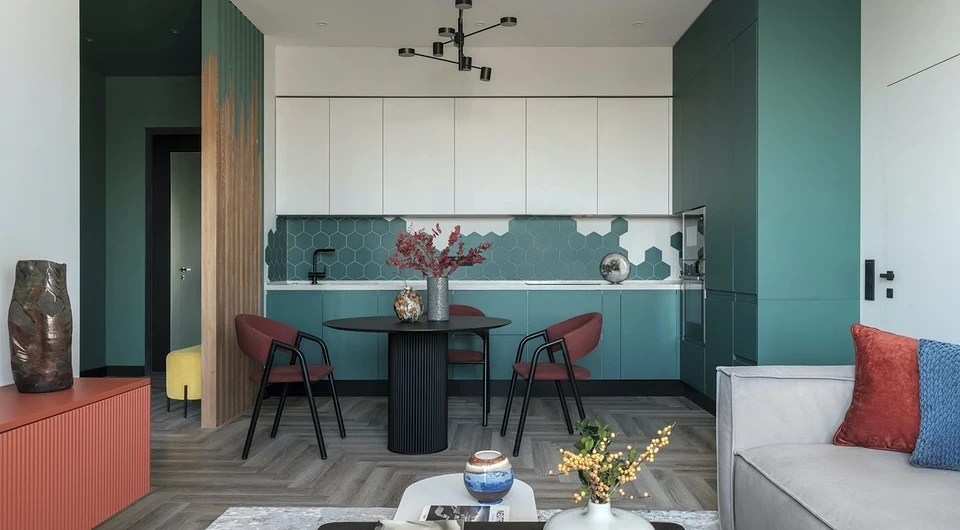 Интерьер этой квартиры сам по себе полон цвета, но есть несколько элементов, которые выглядят очень креативно и выделяются даже на таком ярком фоне. Один из них — фартук в кухонной зоне. Он оформлен плиткой в форме шестиугольников. Большая часть представлена сложным зелено-голубым оттенком (он является лейтмотивом всей палитры). В хаотичном порядке на фартуке выложены элементы такой же формы, но белого цвета. Получается необычный и эффектный прием, который становится полноценным акцентом в интерьере кухни-гостиной.