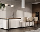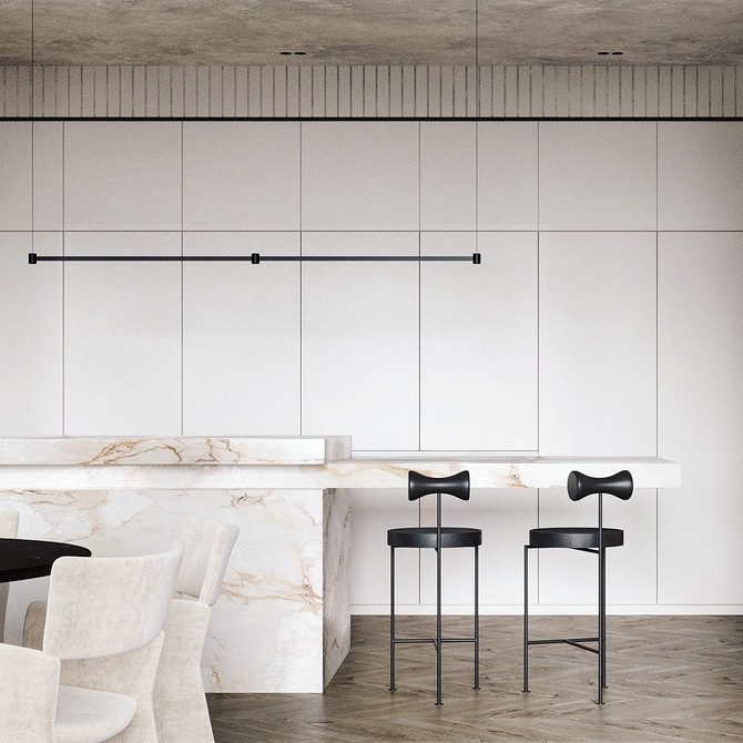 - Если есть обеденная группа, самое верное решение — установить люстру или подвес над ней. Другой вариант — над барной стойкой. Причем может быть как одна крупная люстра, так и группа из 2-3 плафонов.