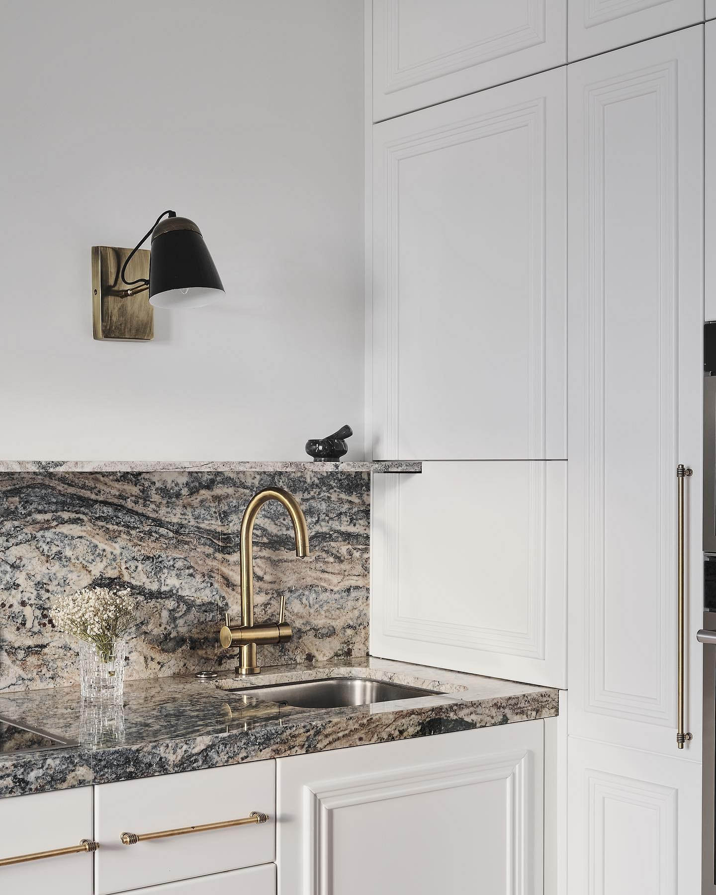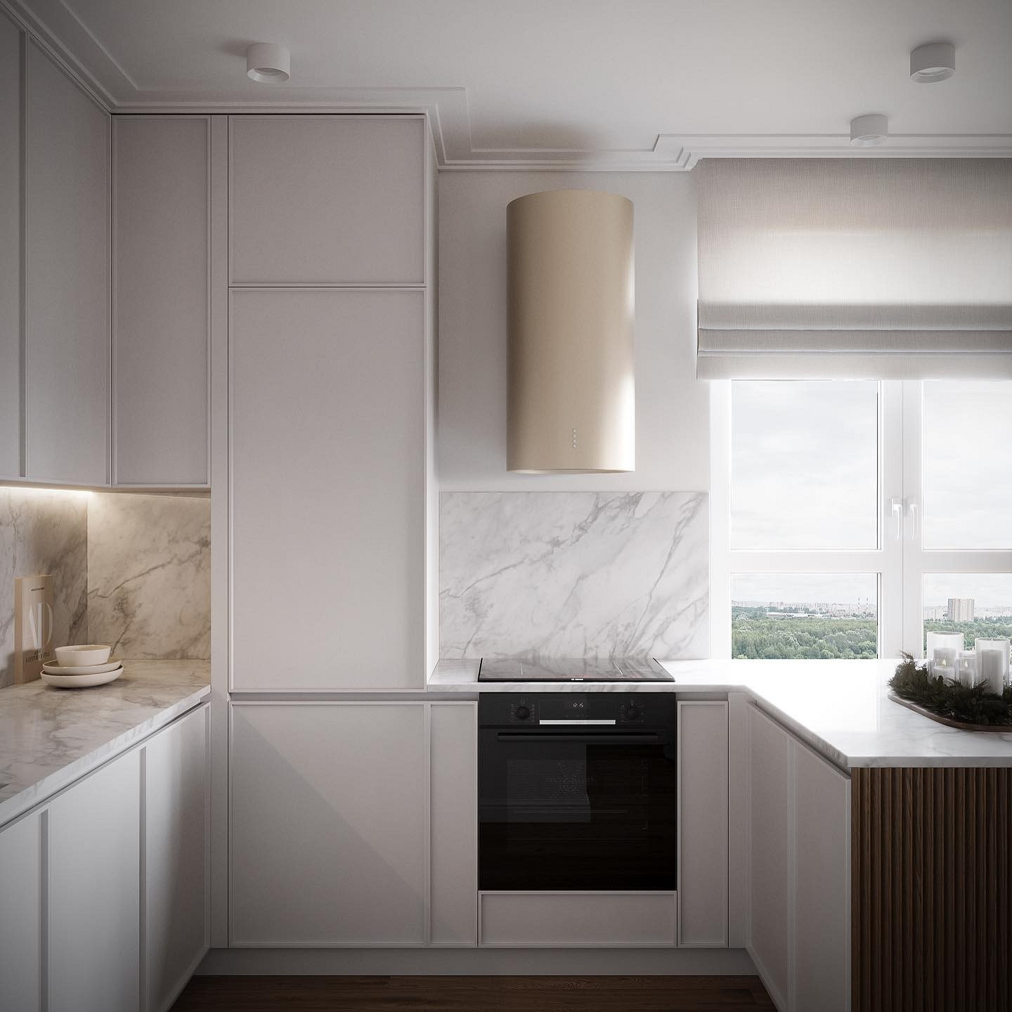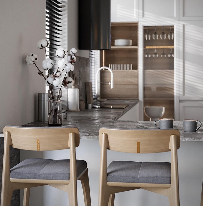 Также возьмите на вооружение классический прием из скандинавского стиля: светлая база прекрасно сочетается с натуральными материалами, будь то дерево или камень. А если хочется больше цвета, сделайте двухцветный гарнитур: например, низ кухни белый, верх — бежевый, мятный, голубой, розовый и т.п.