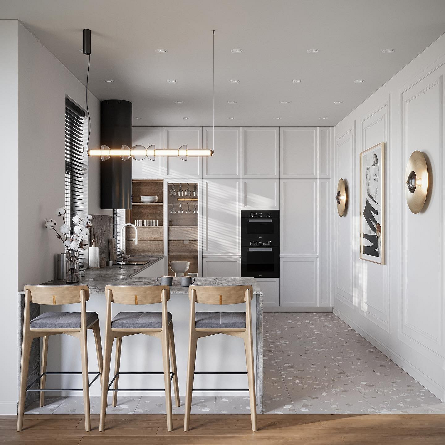 Поскольку это комната с очень агрессивной средой, покрытие пола должно обладать высокой износостойкостью. Хороший выбор — плитка или керамогранит, поскольку он выдерживает еще и удары, плитка и ламинат. Влагостойкий ламинат тоже подходит, он выглядят очень достойно даже в неоклассических интерьерах. Также сейчас дизайнеры часто используют кварцвинил, причем во всей квартире сразу.